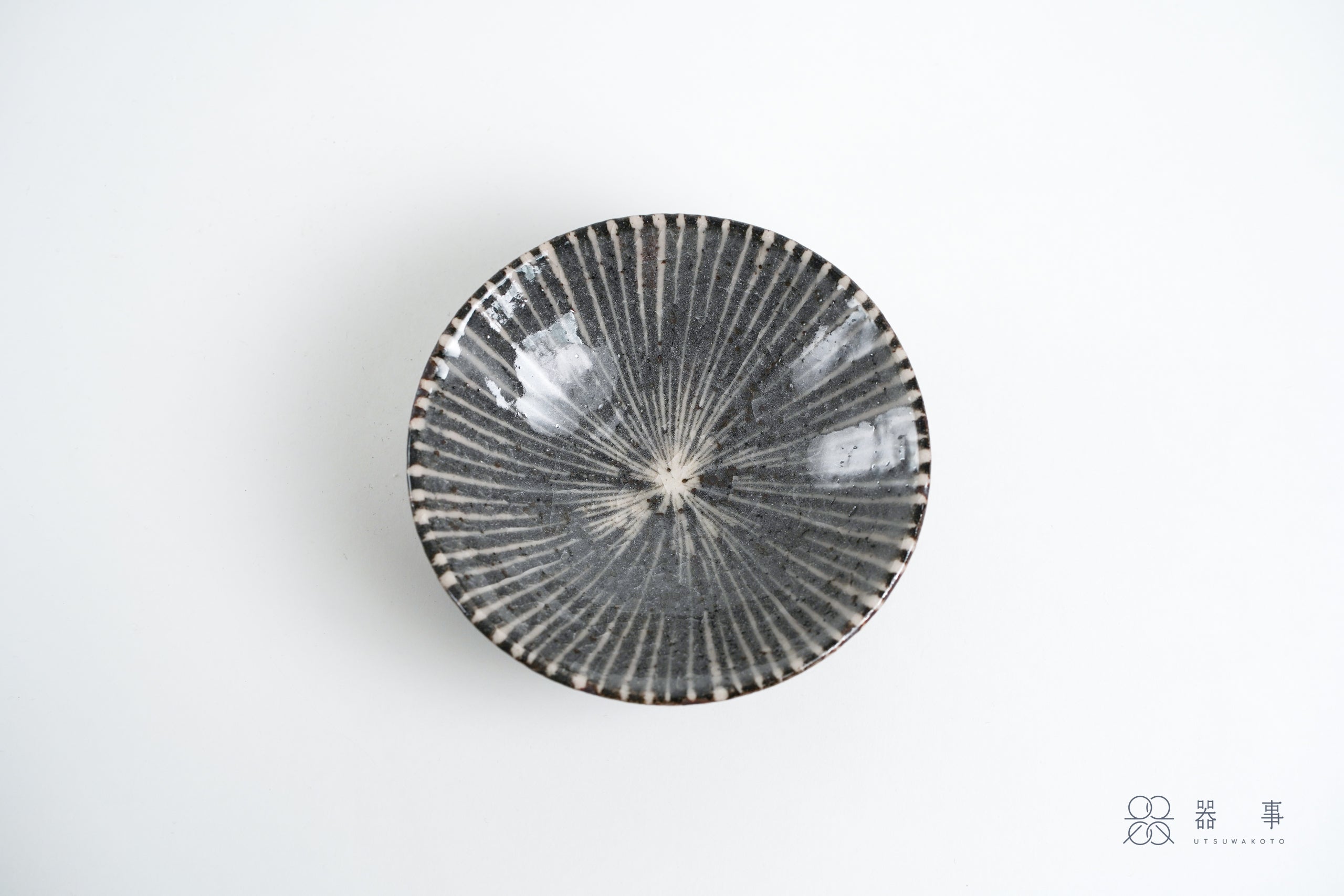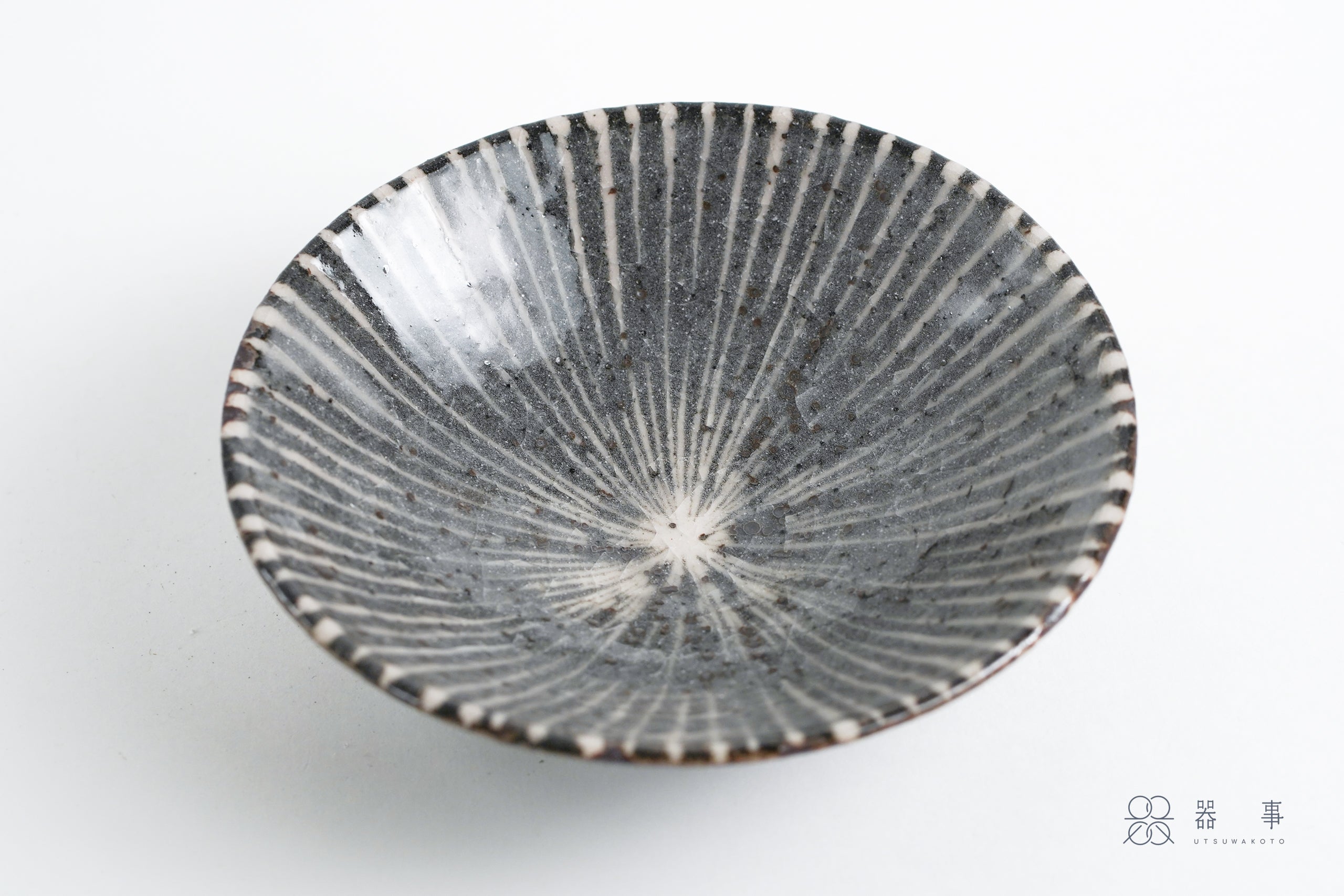 這只鼠志野釉十草五寸皿,白色十草紋從盤緣一路延伸,在中心匯聚,帶著一種流動的韻律感。