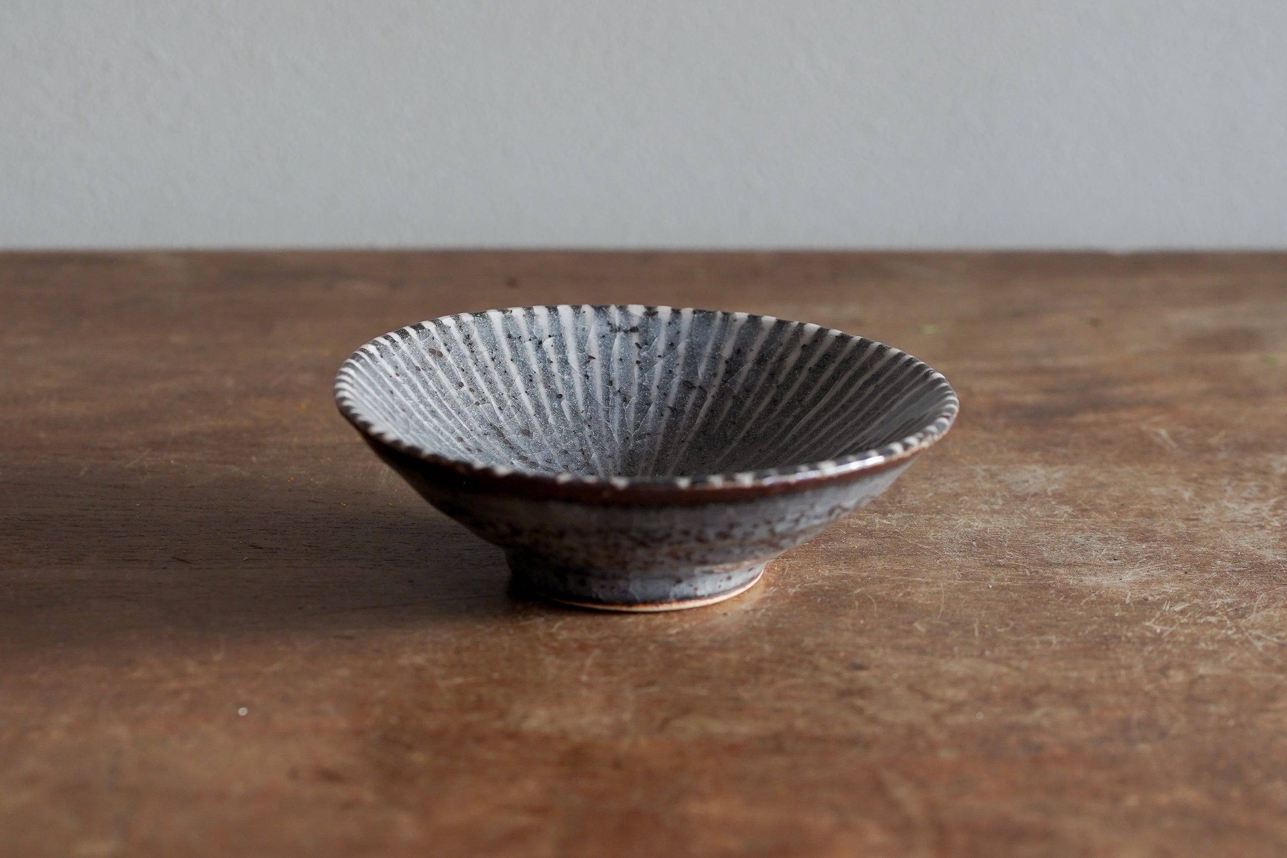 三浦繁久老師製作的鼠志野釉十草五寸皿,沉穩的灰色調與十草紋樣,兼具視覺張力與質樸手感,是餐桌上用途廣泛的一只小皿。
