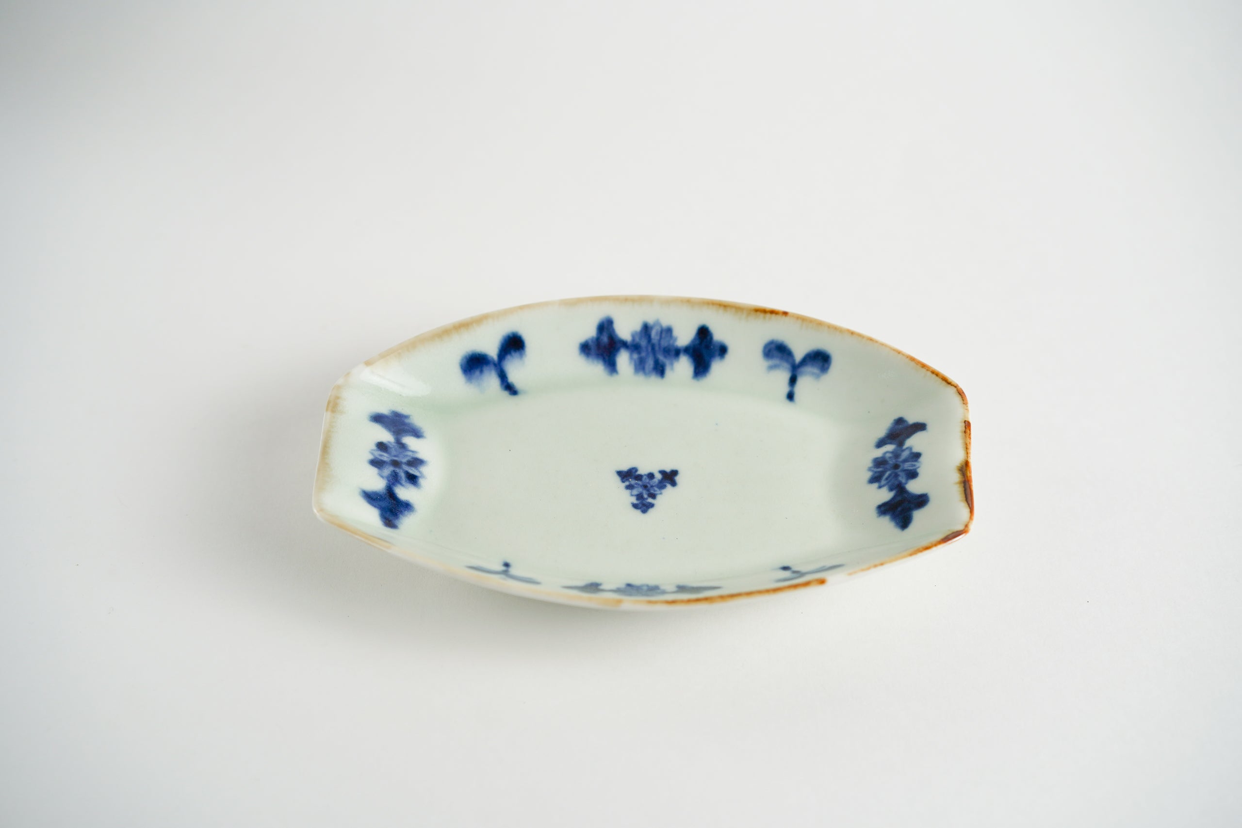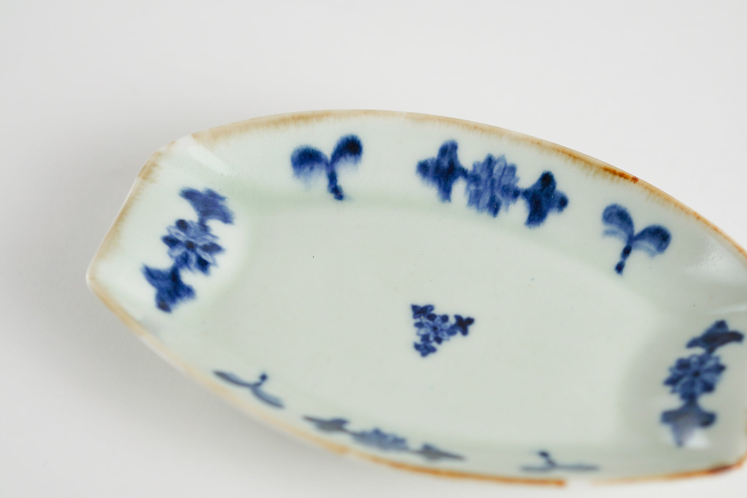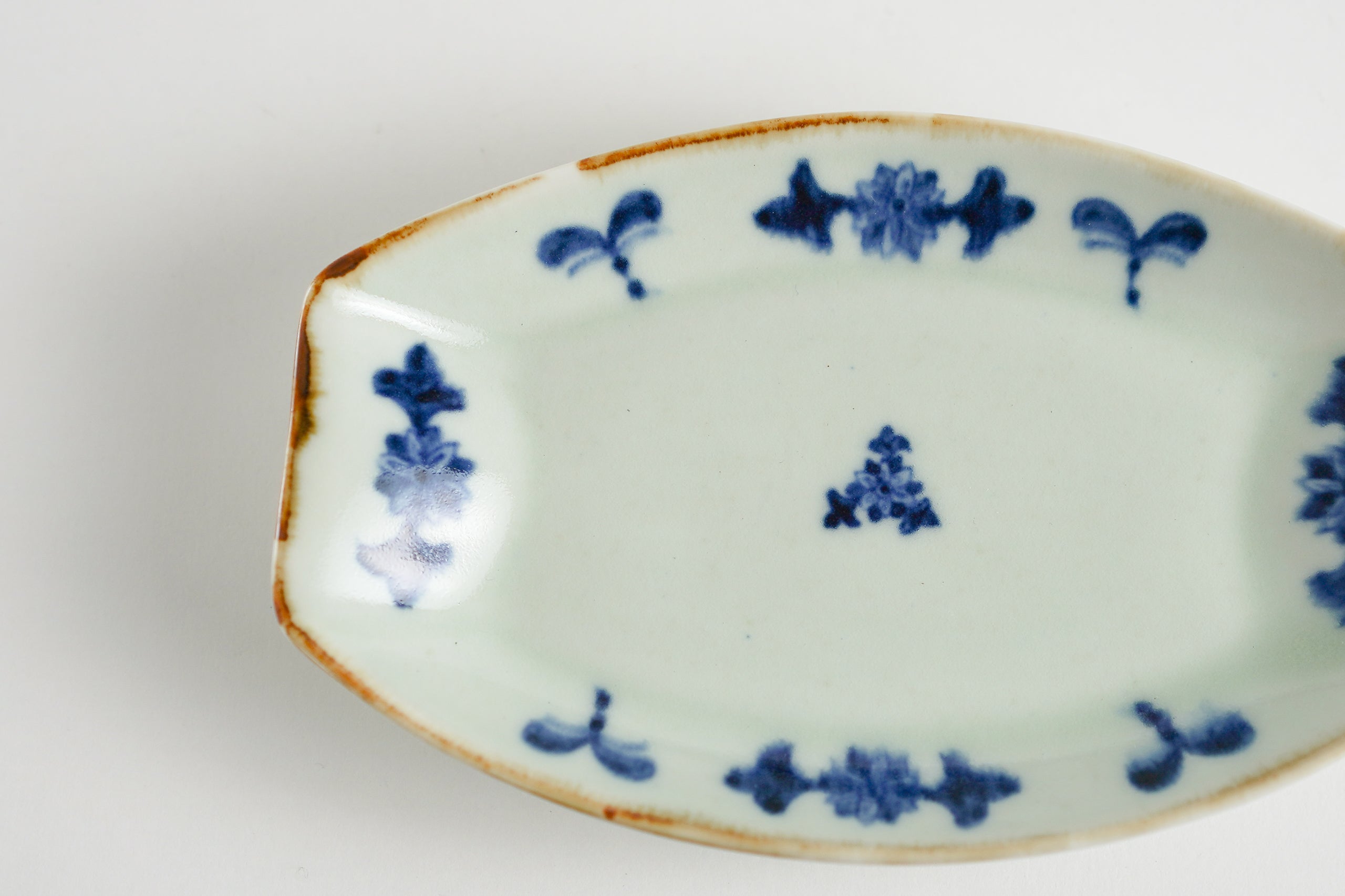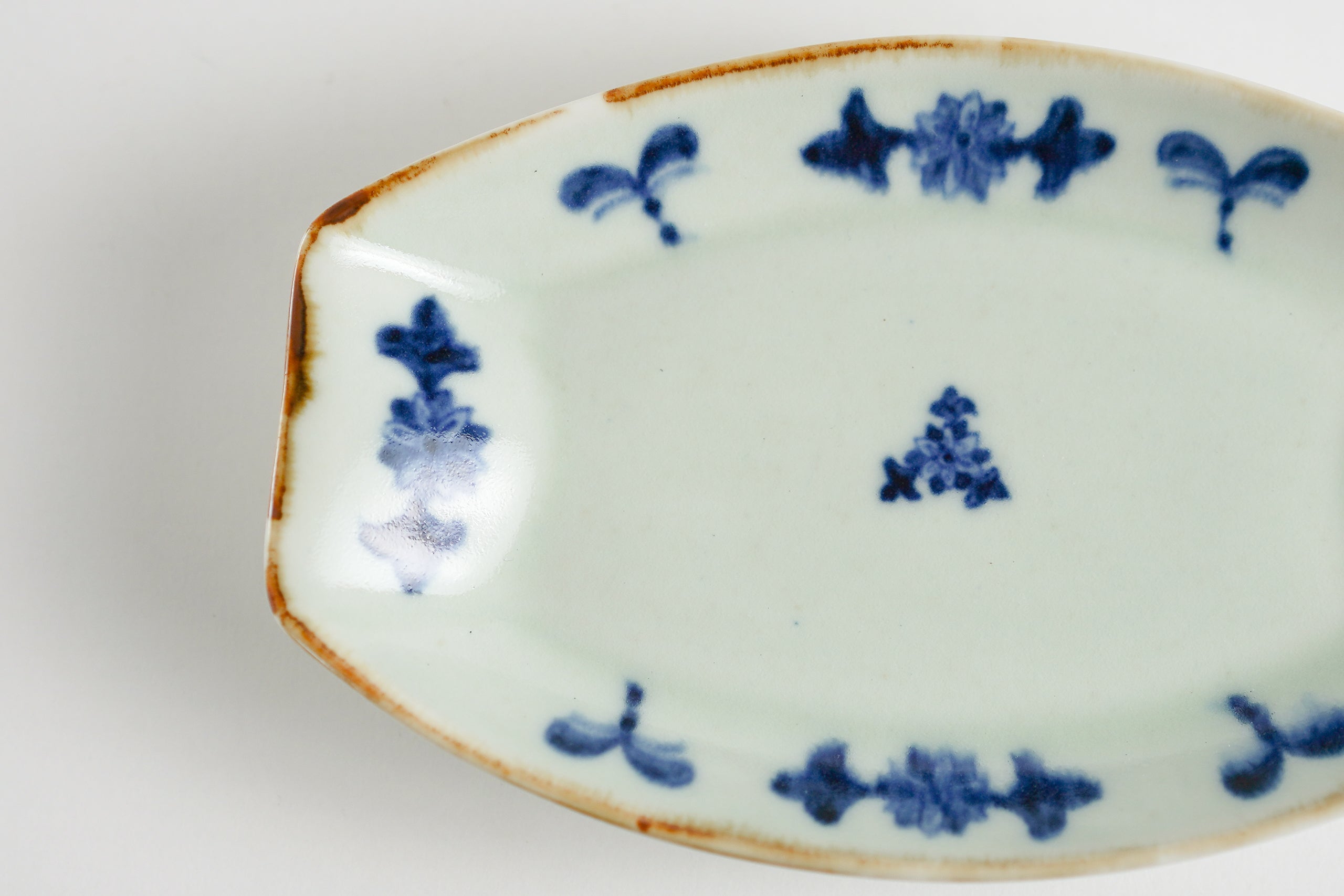 白色磁器的光澤溫潤,帶有一點青色調,與藍色紋樣形成清爽的對比。特別的是,器緣帶有鐵褐色線條,這是焼成時自然形成的效果,展現復古氛圍,為作品增添歲月感與手工質感。