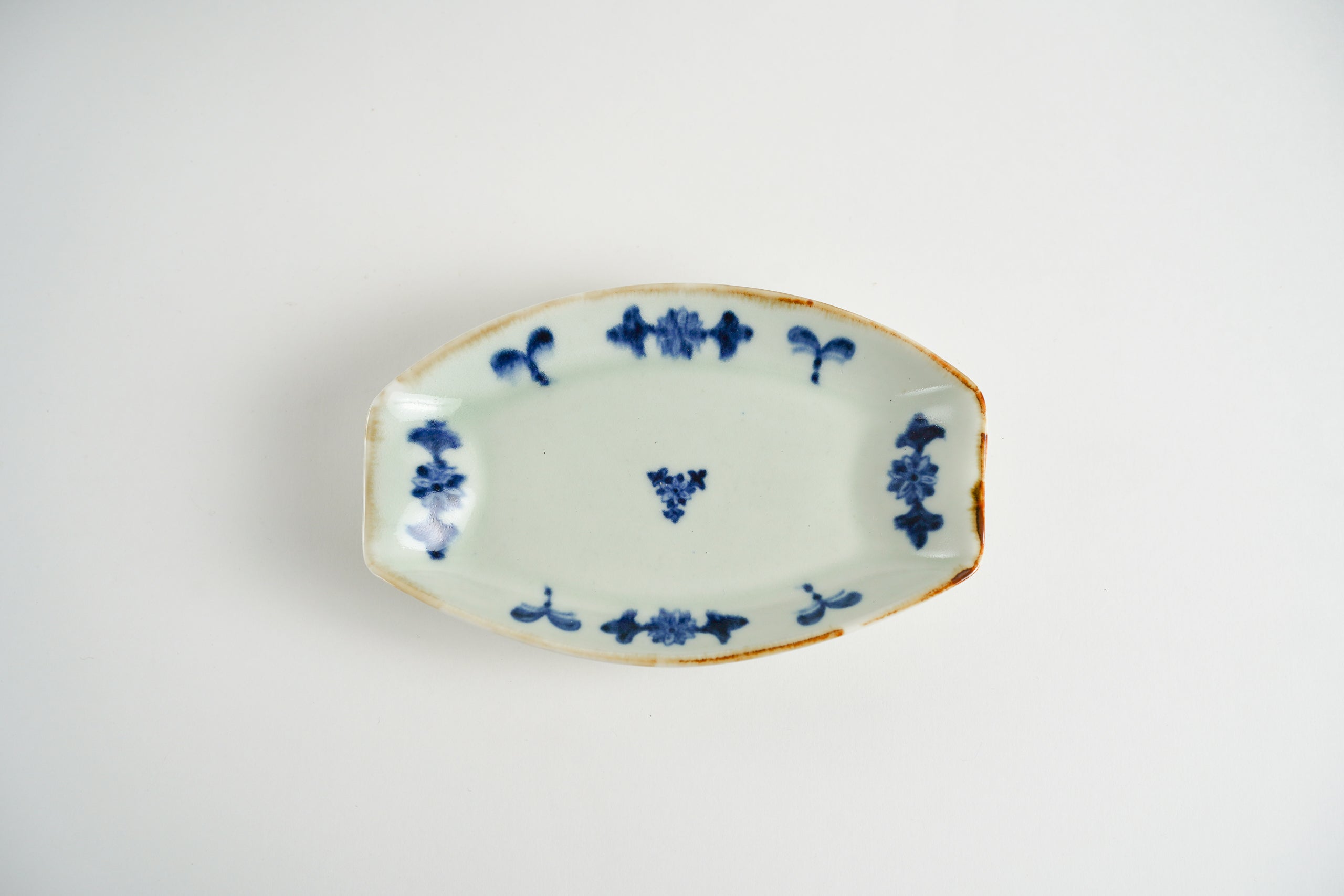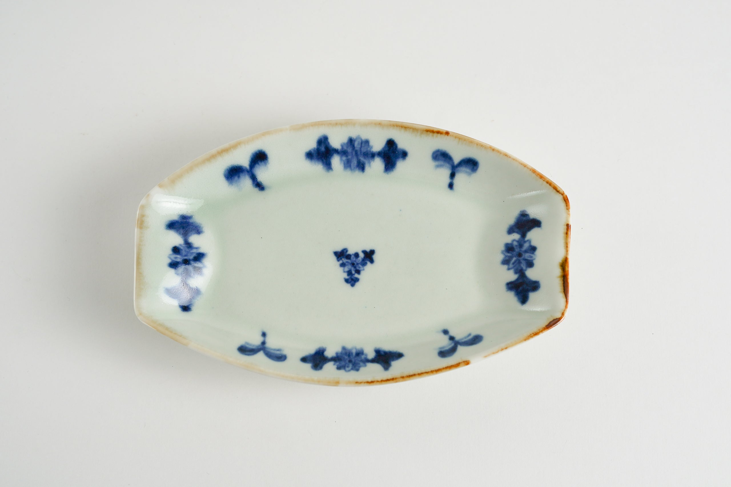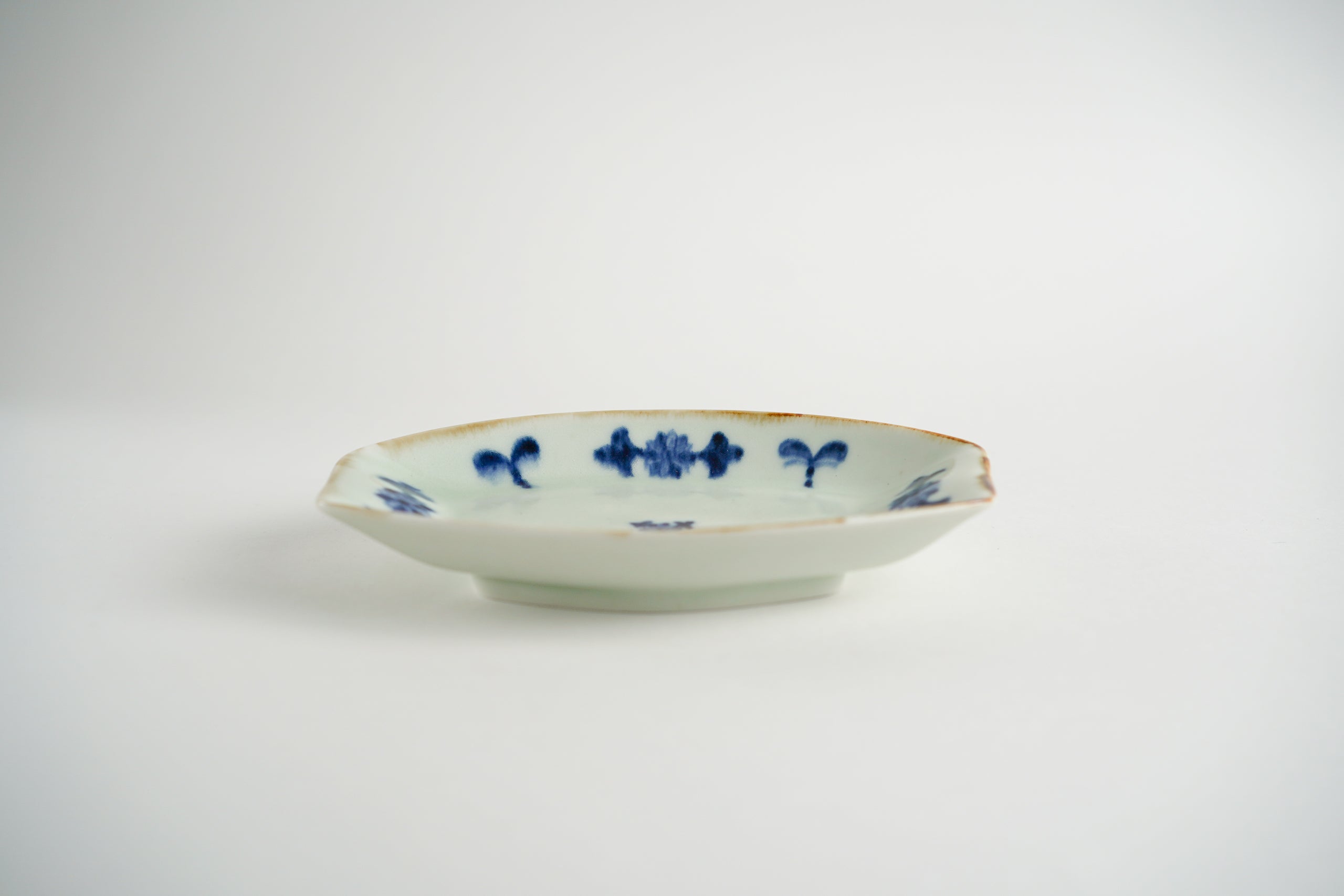 藍色花紋呈現深淺不一的濃淡變化,環繞著小花與葉片紋樣,優雅又可愛。這款點心盤略帶六角形的器形也非常特別,令人喜愛。