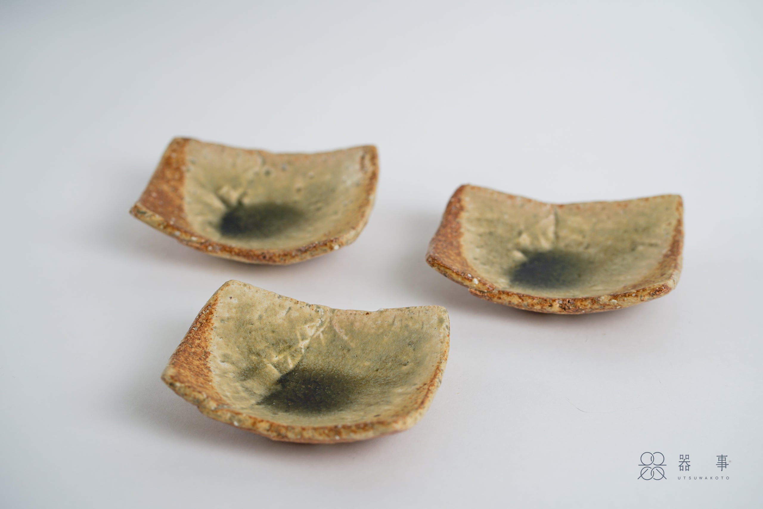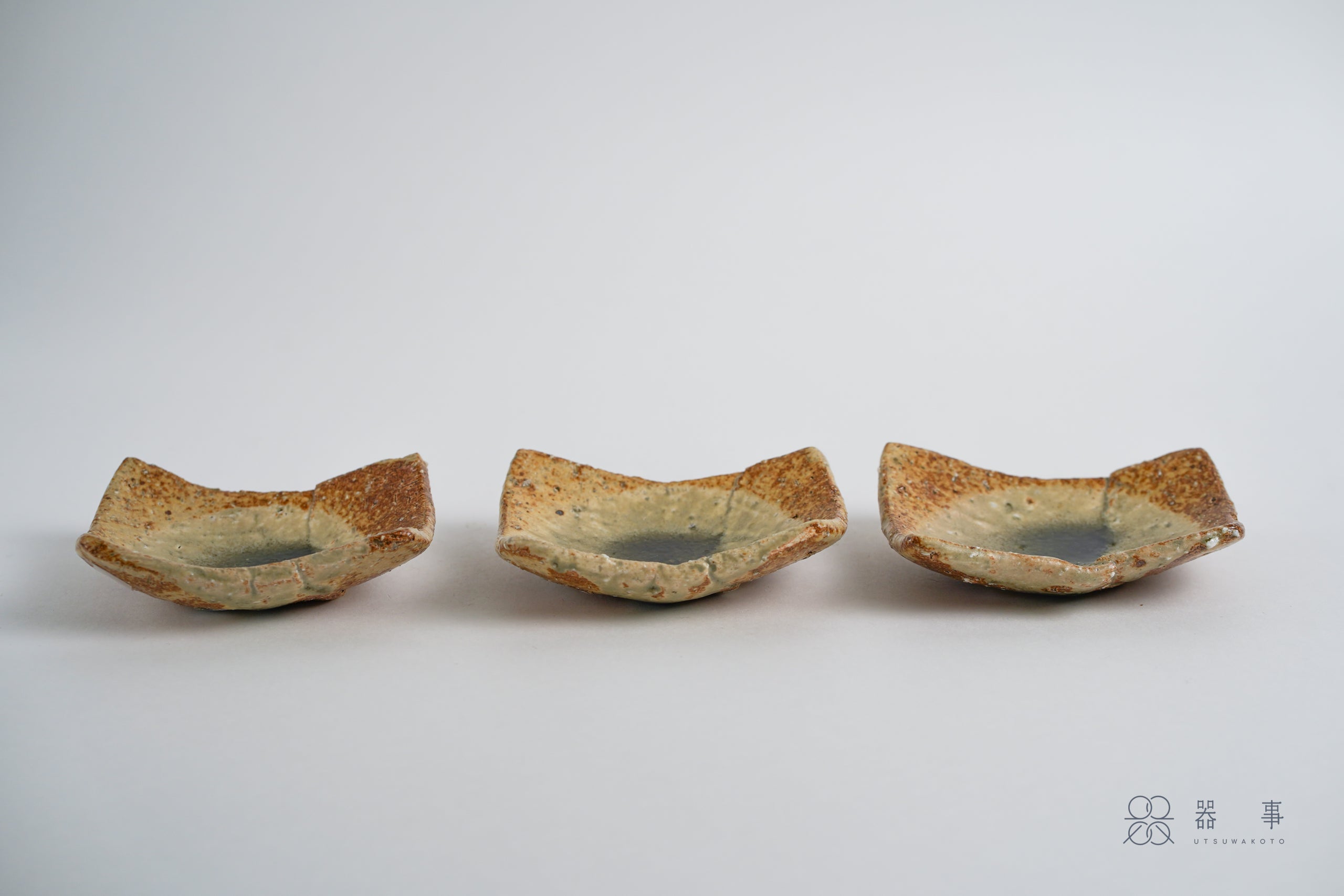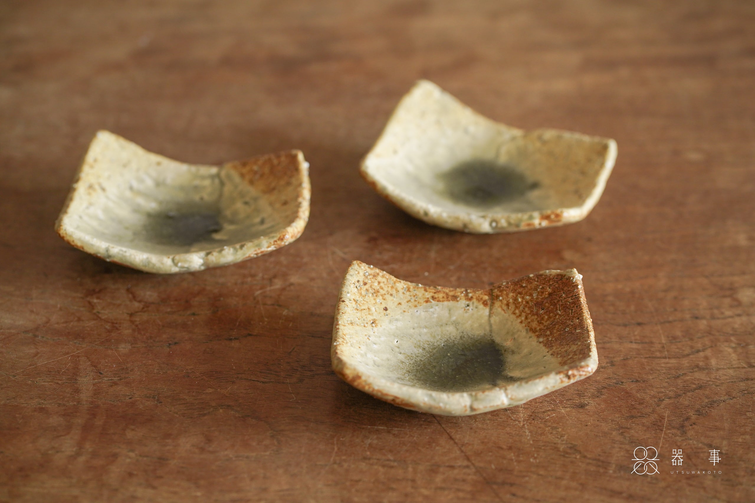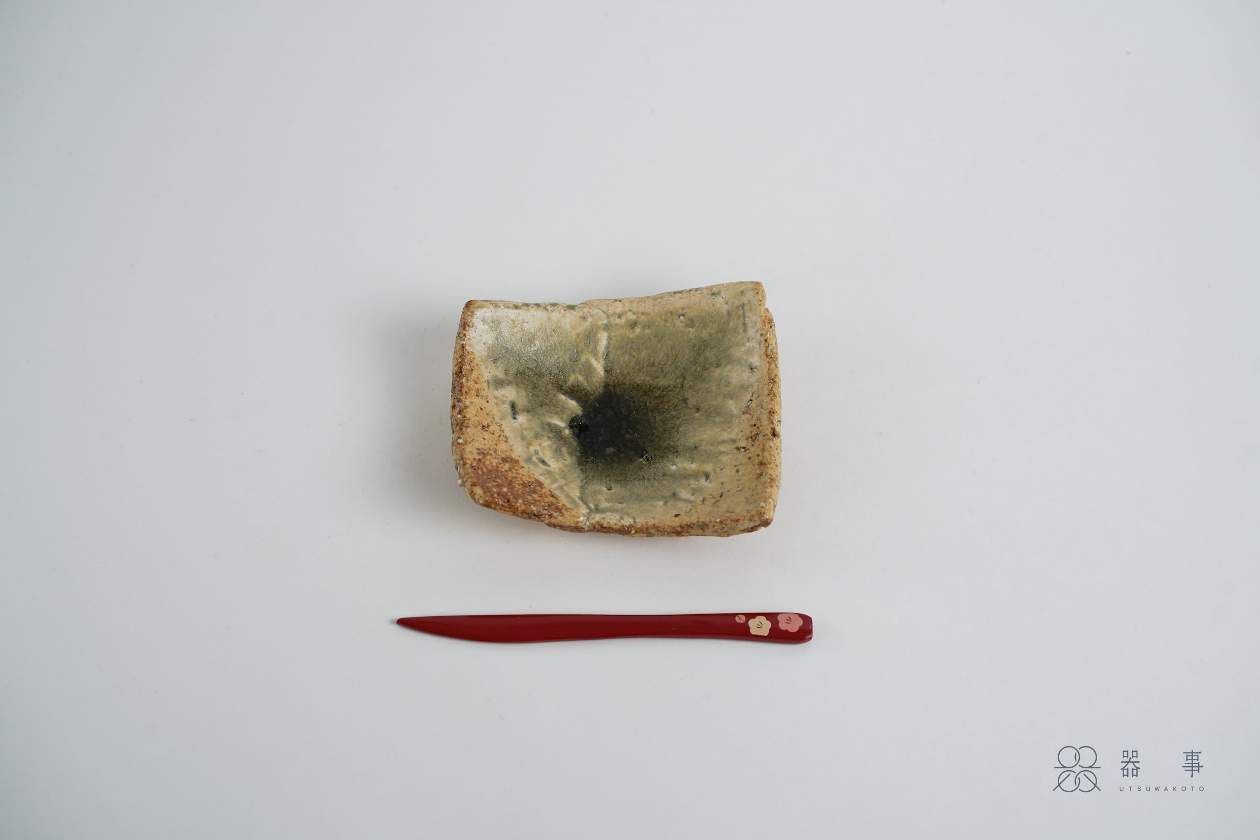 豆皿有著四角微微翹起的不規則造型,邊緣保留著手捏的自然弧度。看似摺痕的設計,為作品增添了個性。