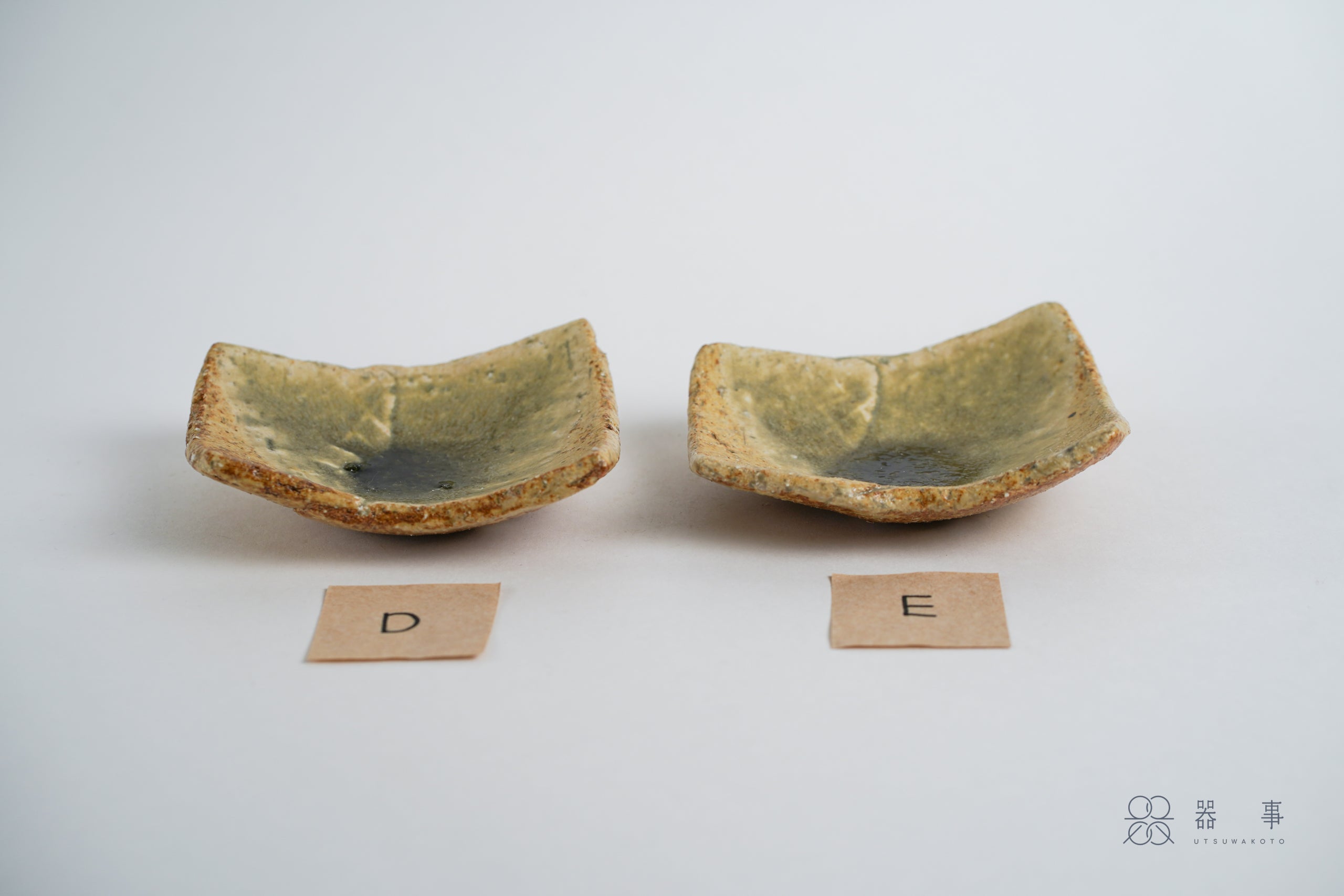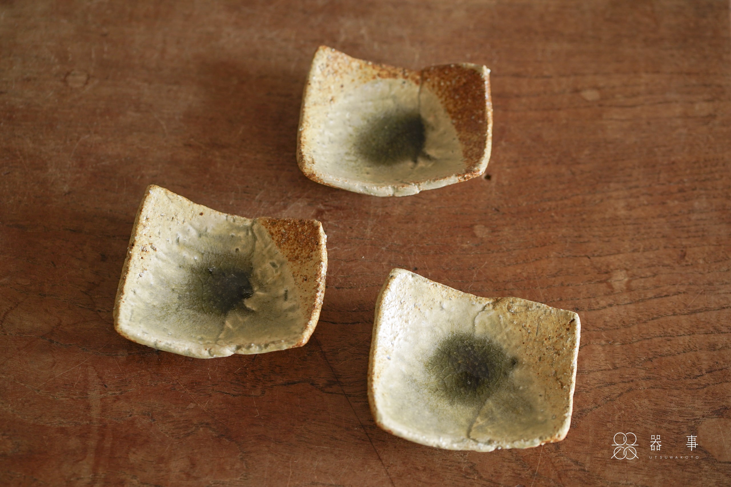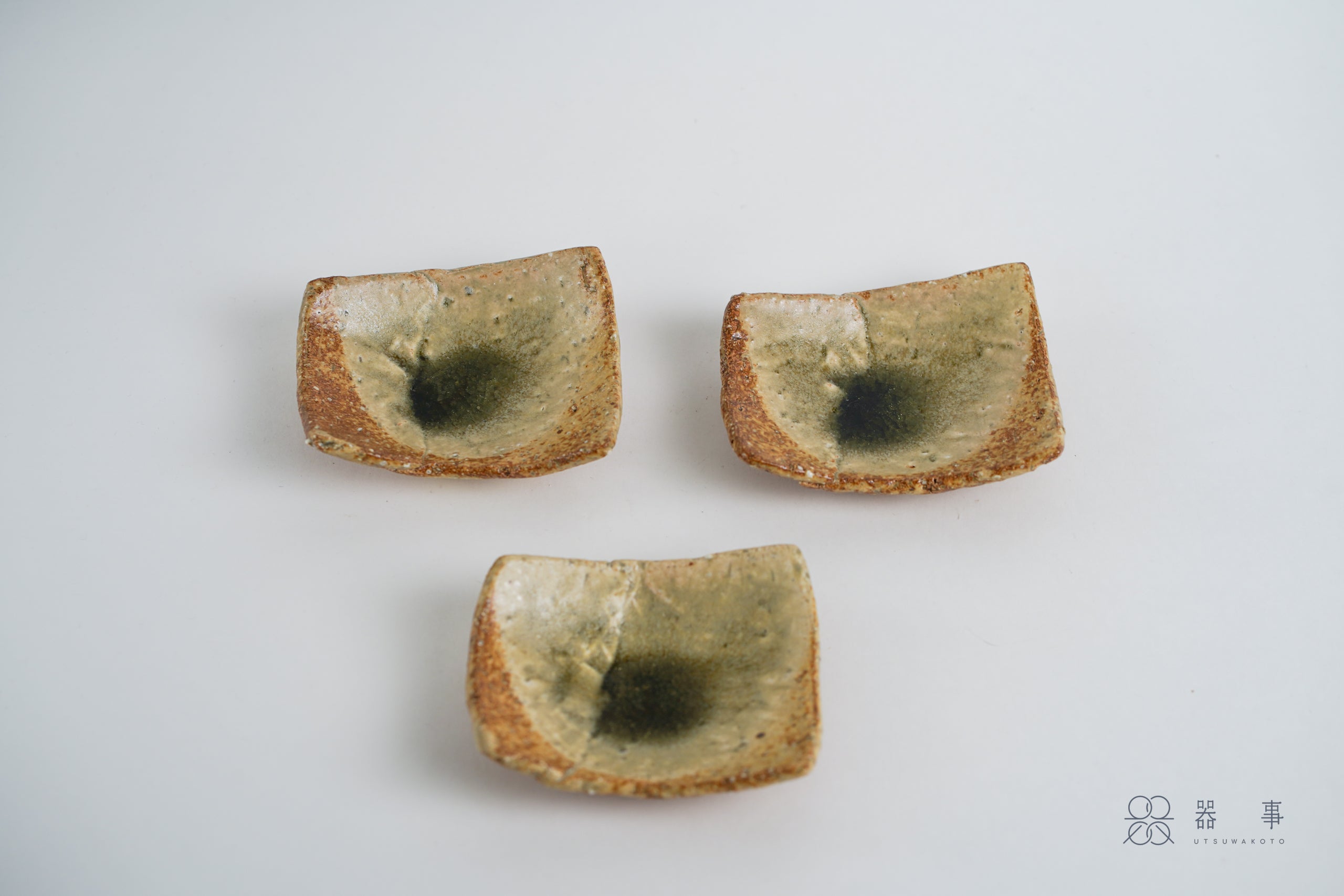 豆皿有著四角微微翹起的不規則造型,邊緣保留著手捏的自然弧度。看似摺痕的設計,為作品增添了個性。