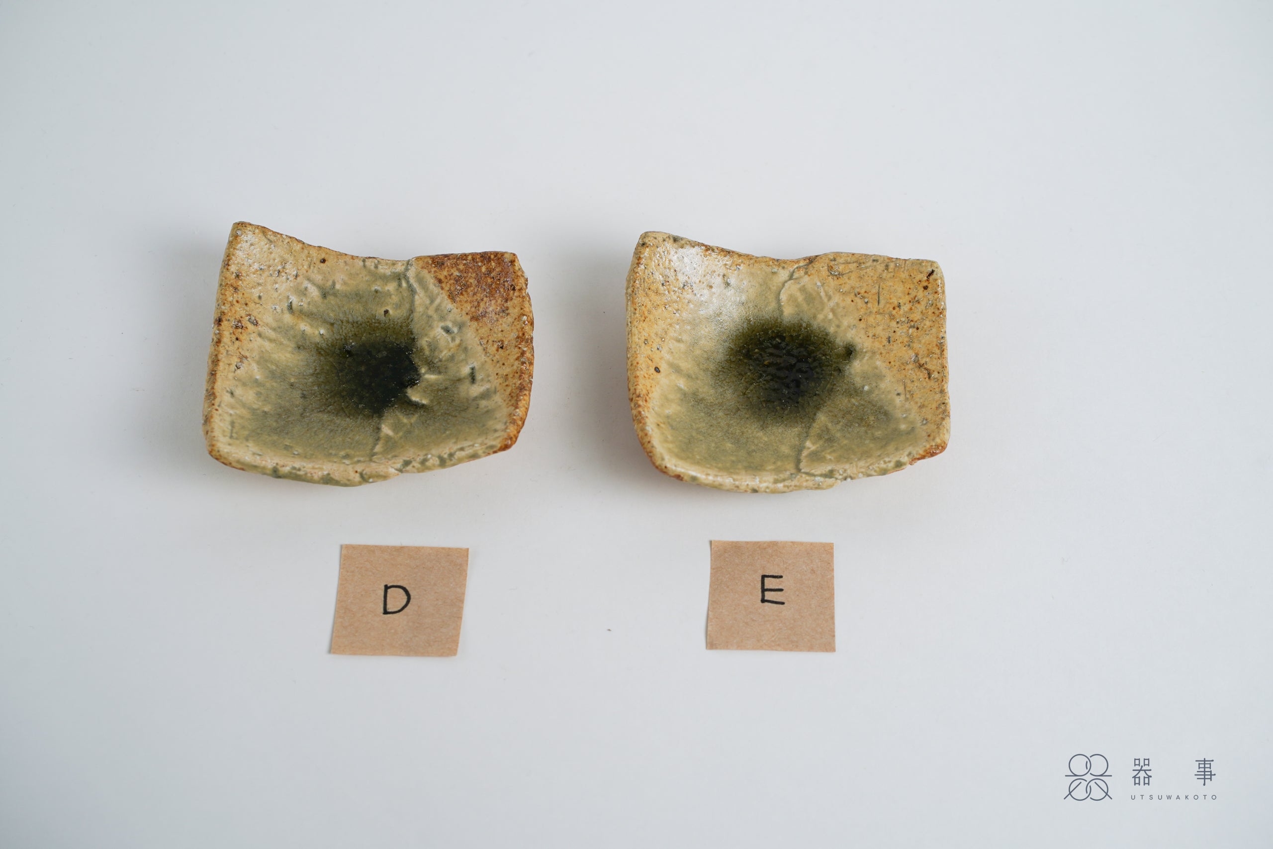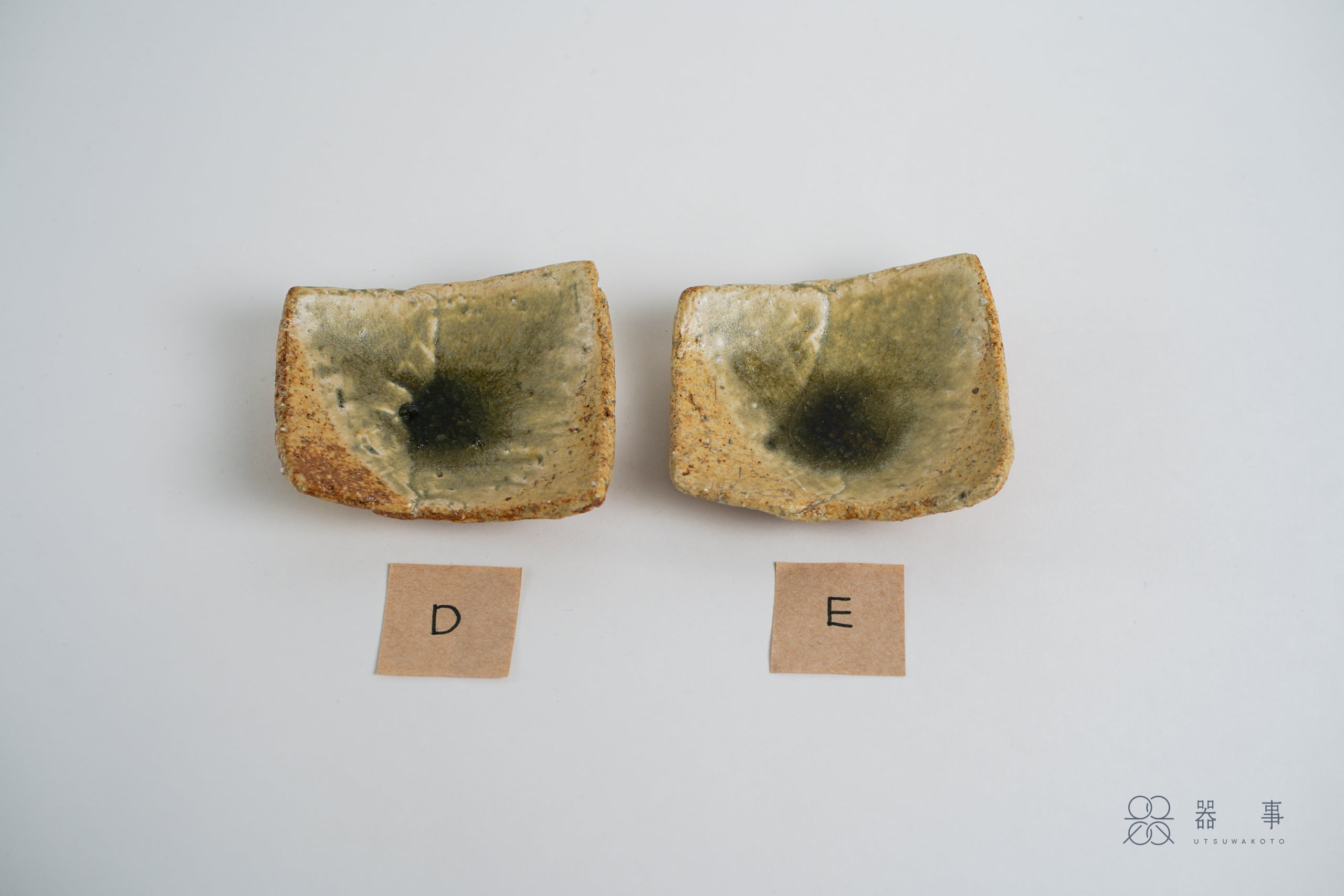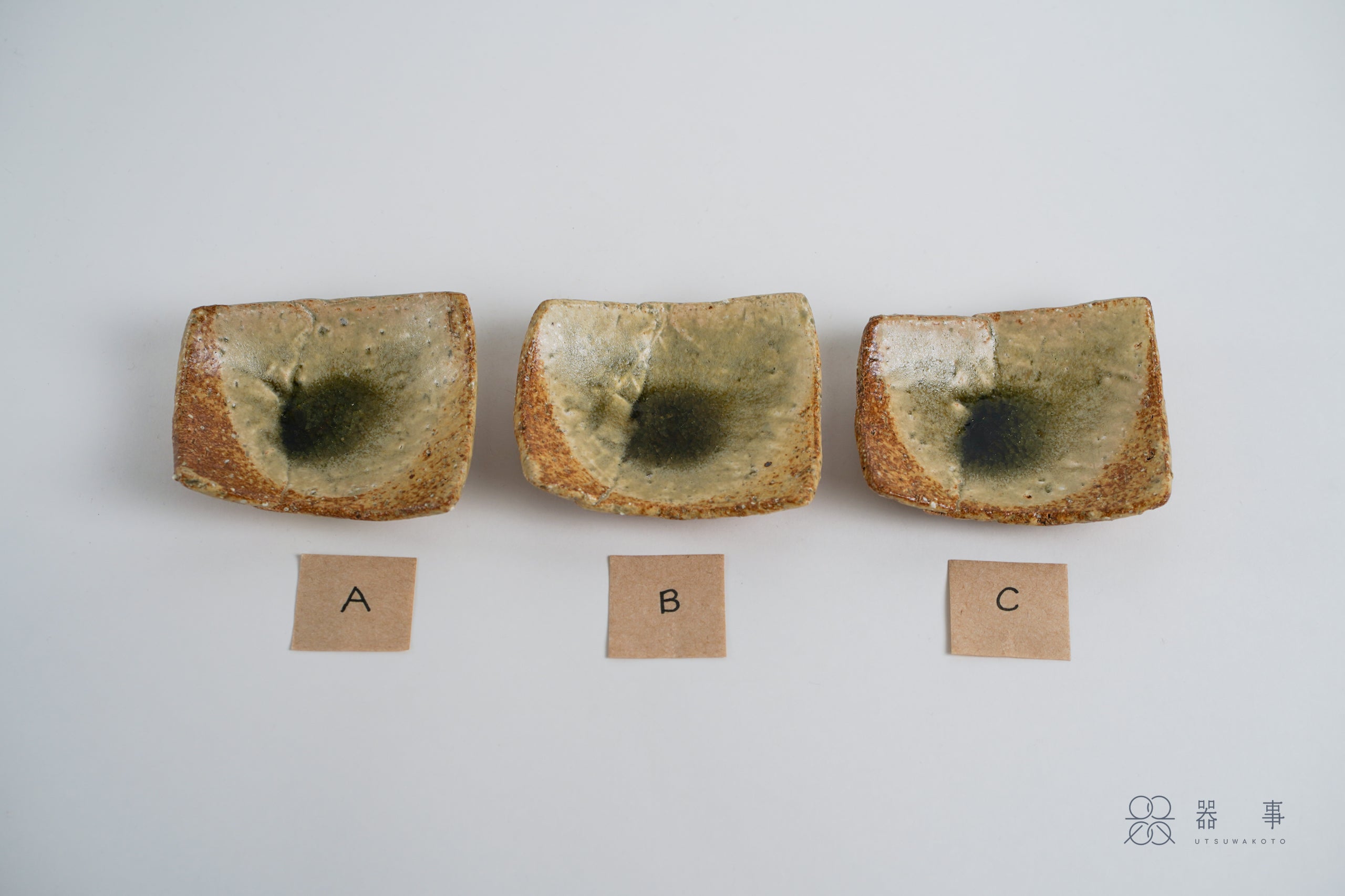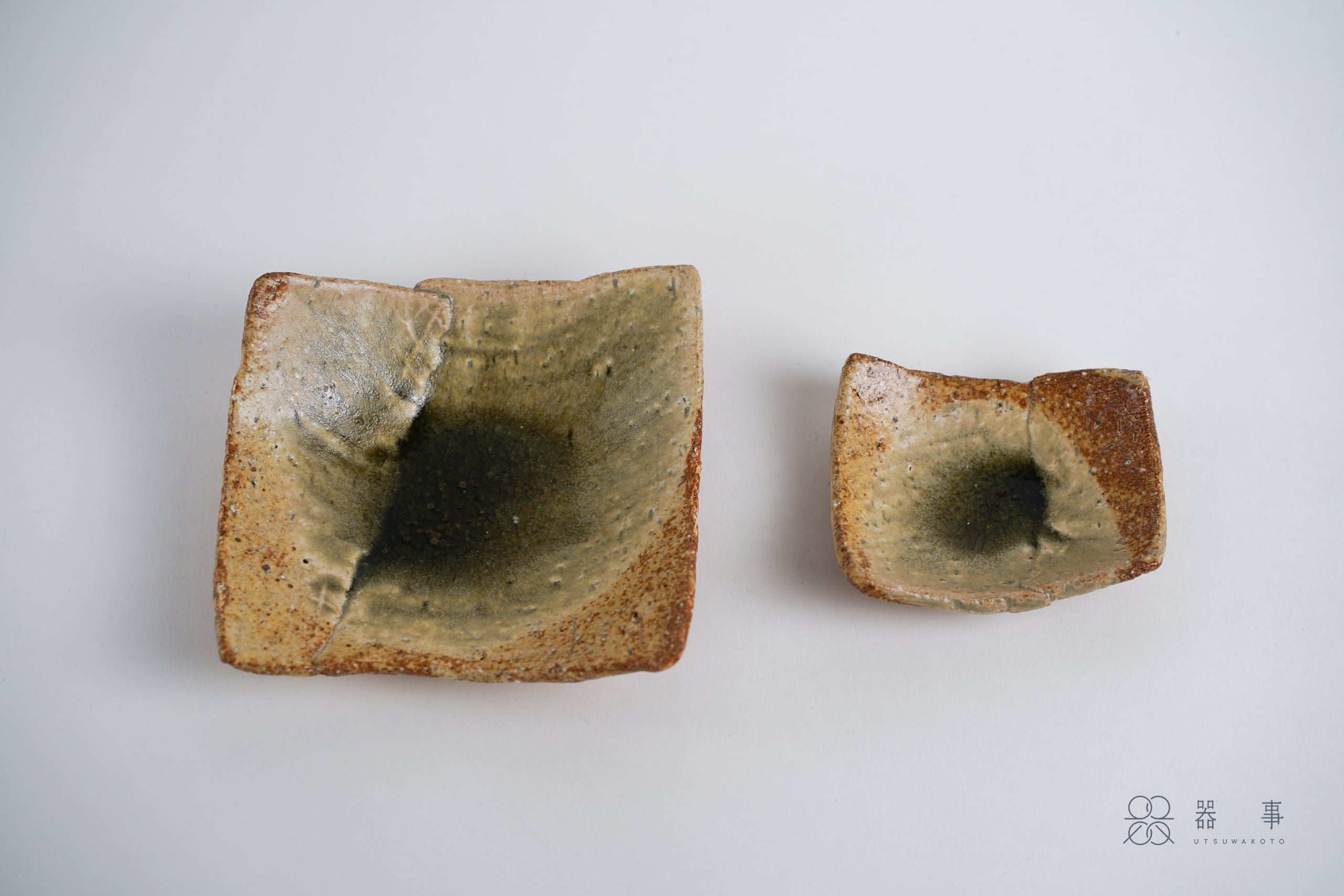 豆皿有著四角微微翹起的不規則造型,邊緣保留著手捏的自然弧度。看似摺痕的設計,為作品增添了個性。