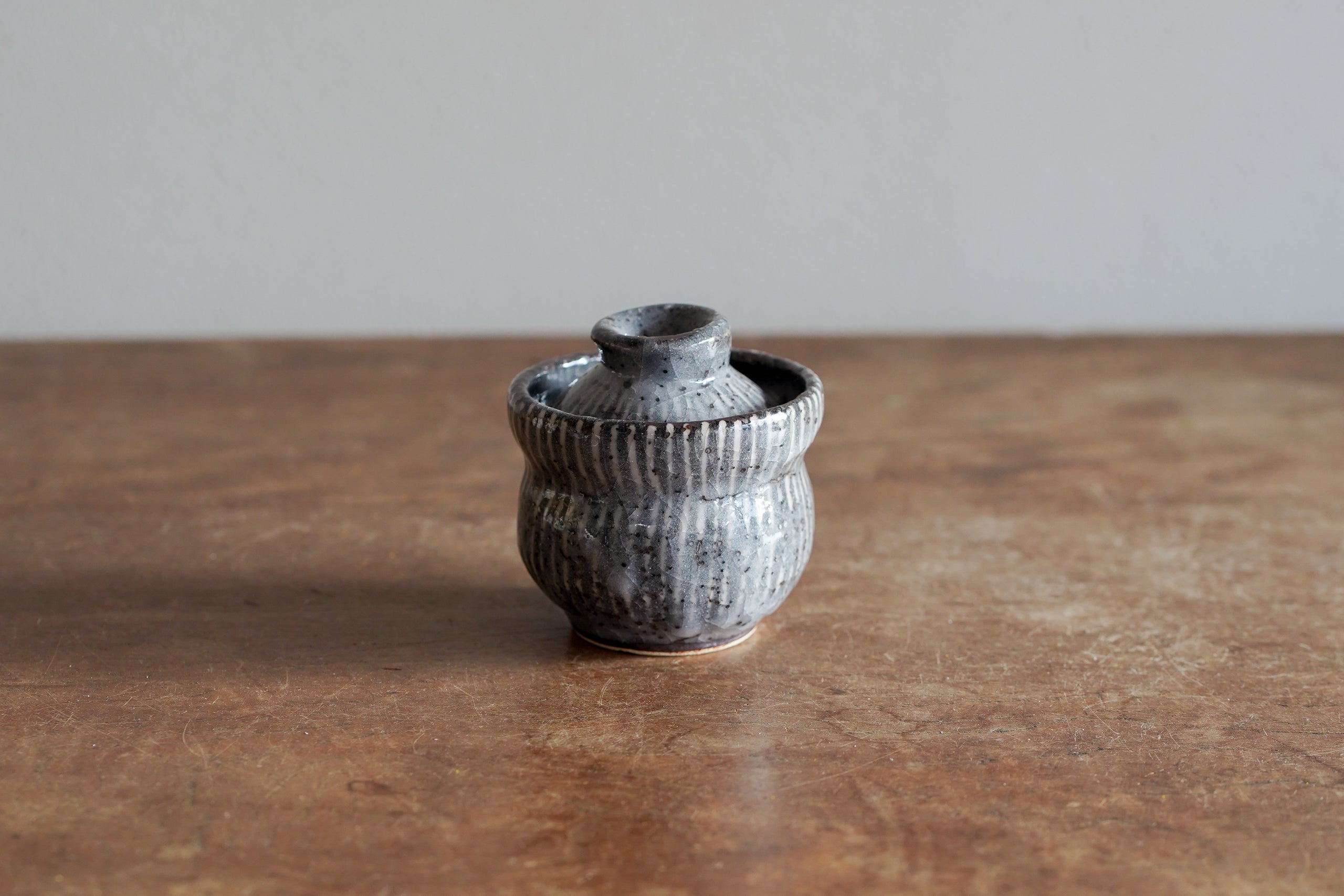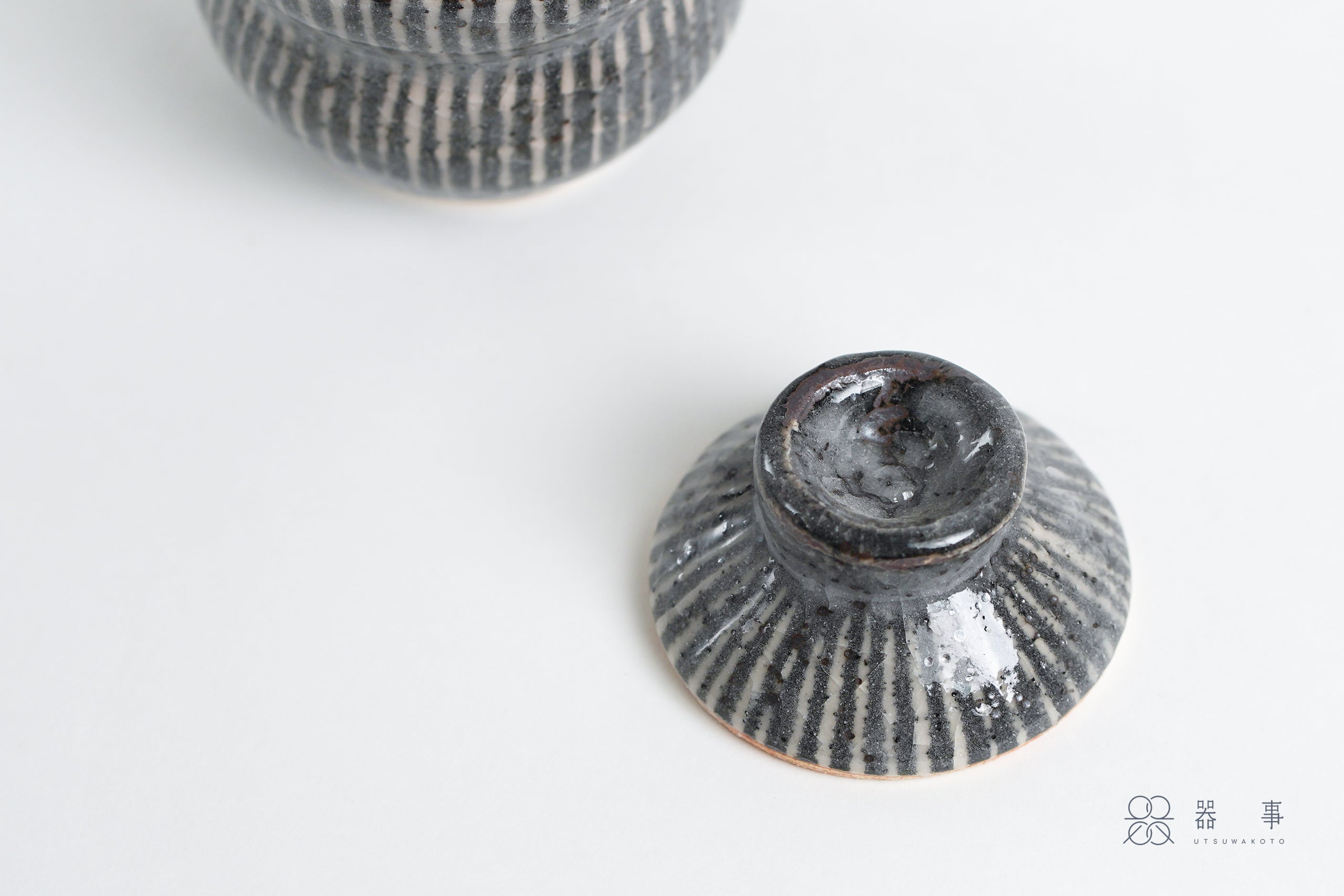 三浦老師製作的蓋物的碗身造型很有特色,飽滿的曲線輪廓,碗身上的十草紋順著曲線排列,灰色釉面上散布著鐵粉小點,蓋面上同樣裝飾著放射狀的十草紋,與碗身的紋樣相互呼應。