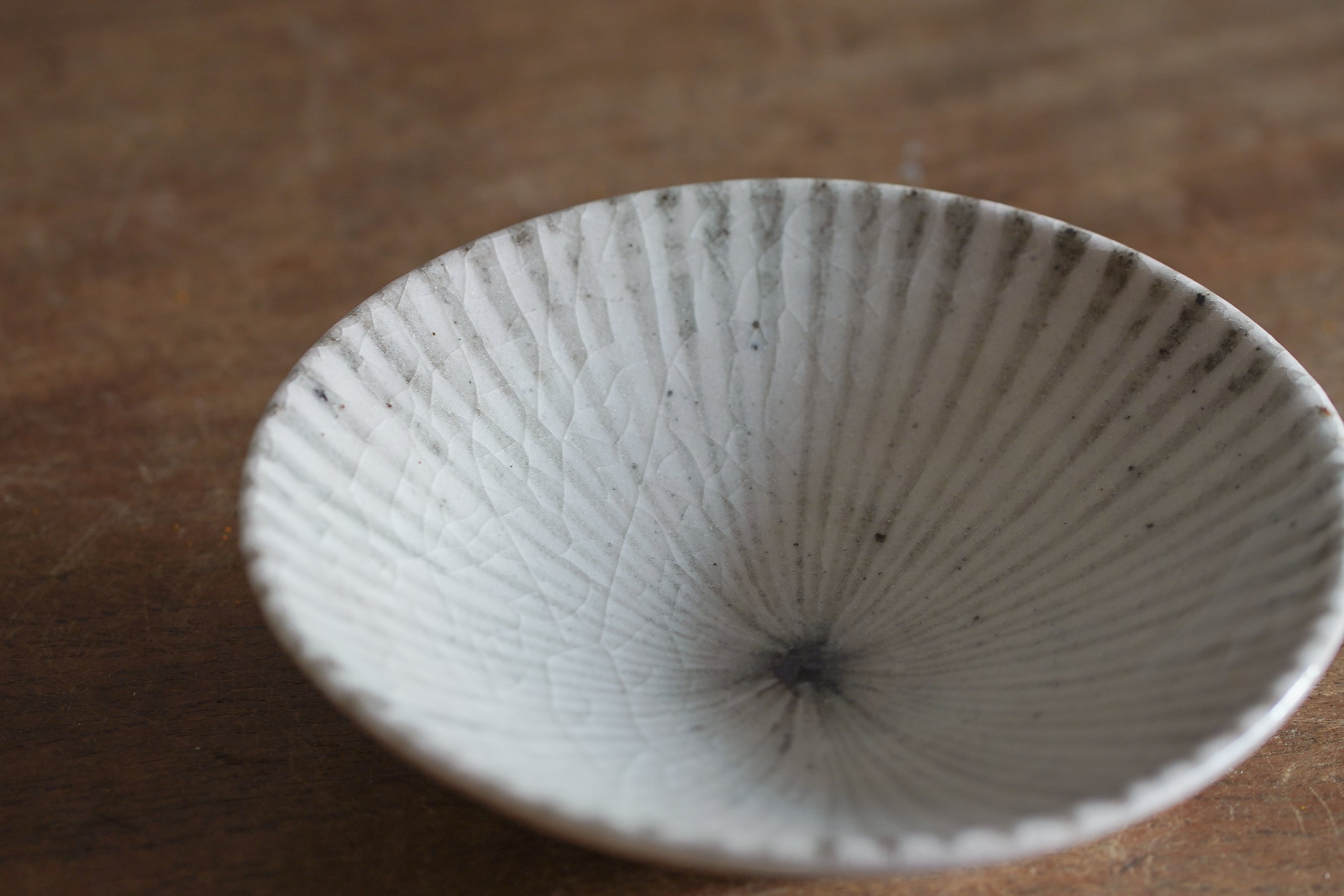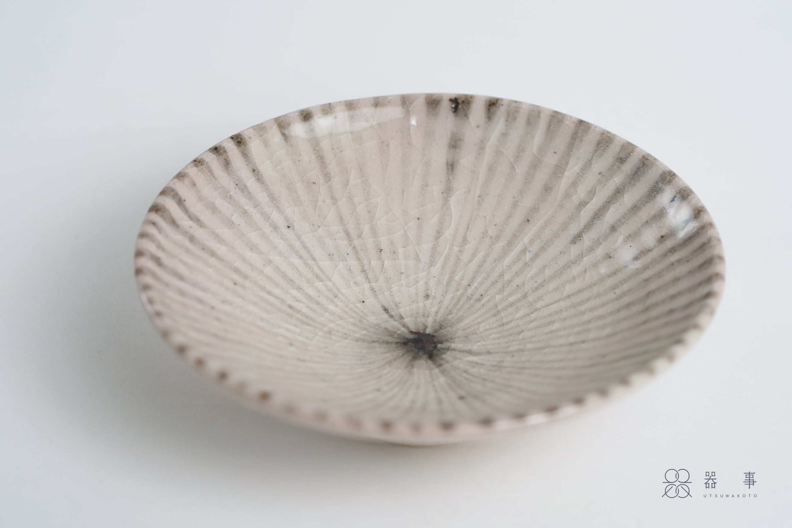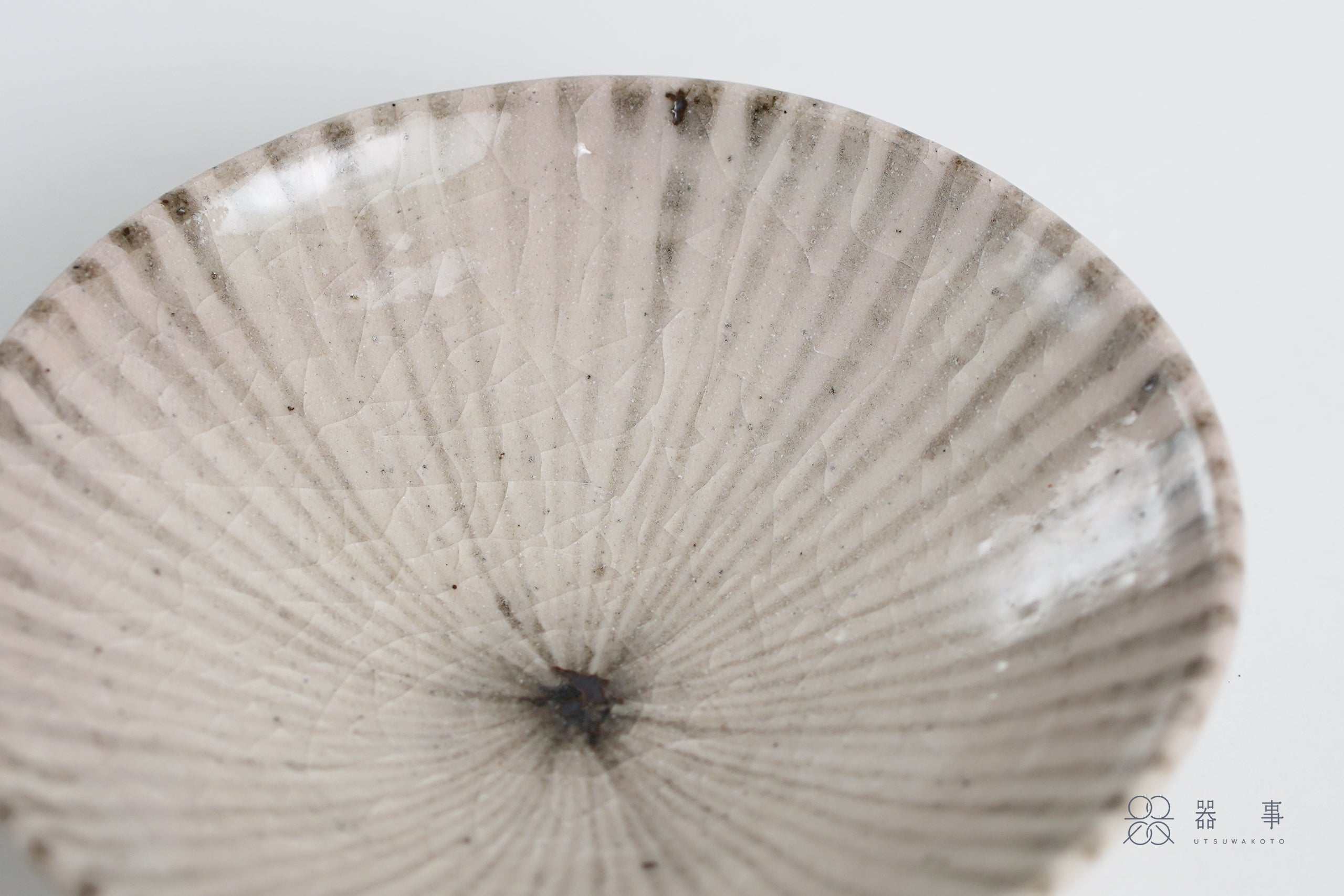 十草紋從盤緣一路向中心匯聚,線條在盤心交會,釉面上還能看到細密的貫入紋理和零星的鐵粉小點,看似素淨的盤面其實充滿了值得欣賞的細節與魅力。