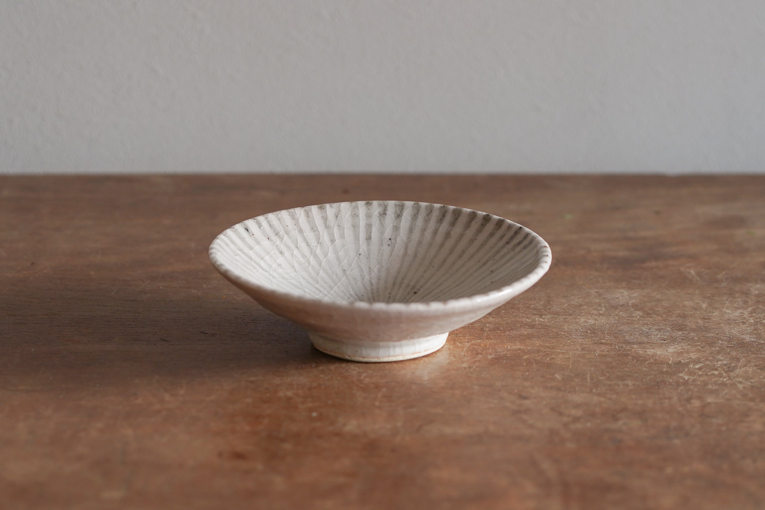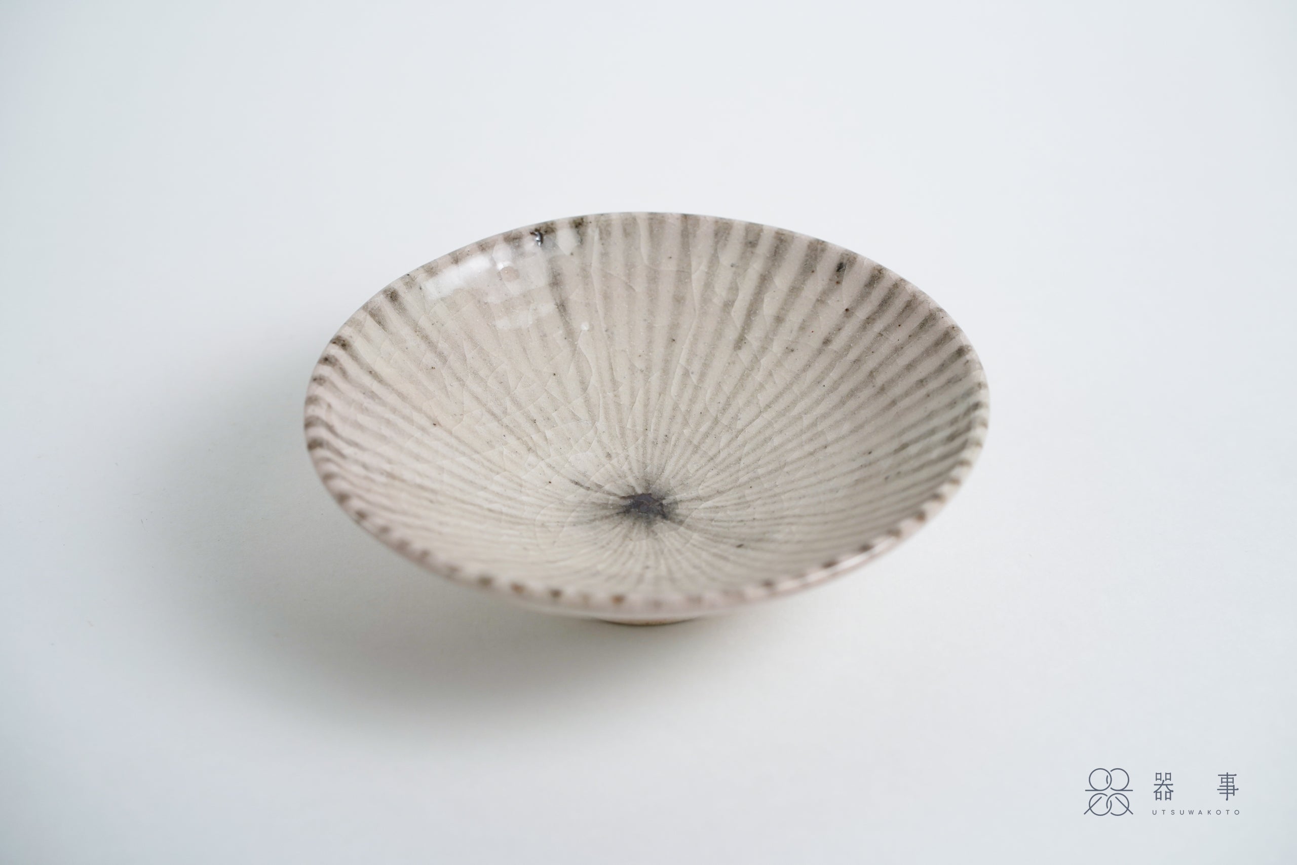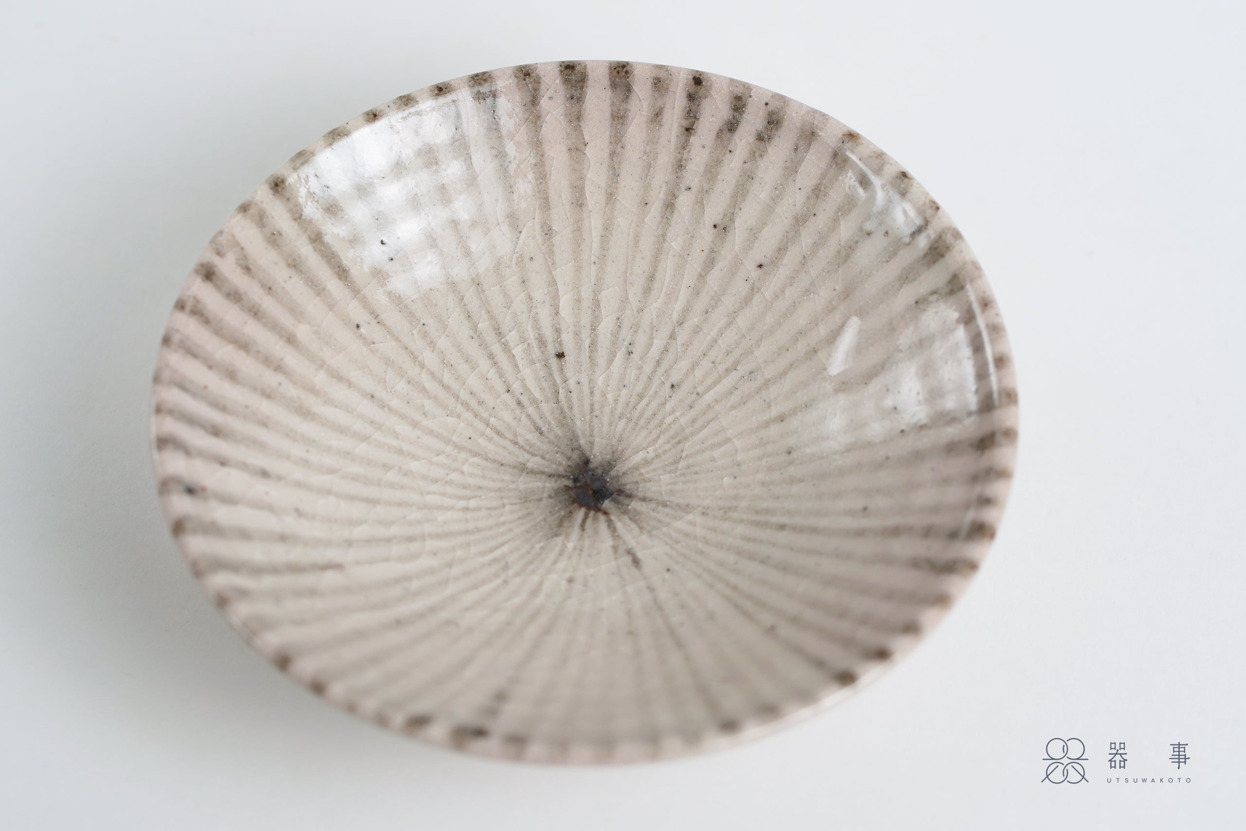 十草紋從盤緣一路向中心匯聚,線條在盤心交會,釉面上還能看到細密的貫入紋理和零星的鐵粉小點,看似素淨的盤面其實充滿了值得欣賞的細節與魅力。