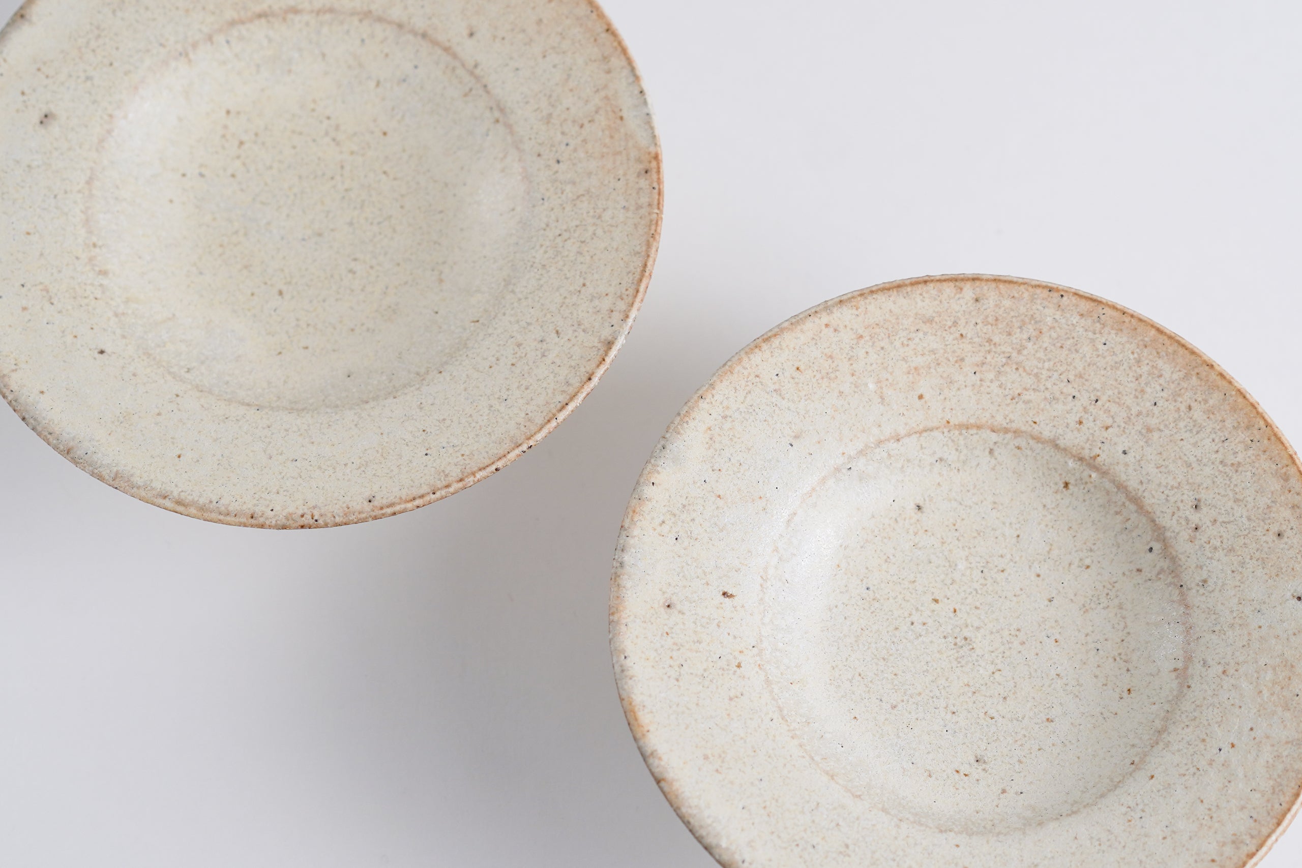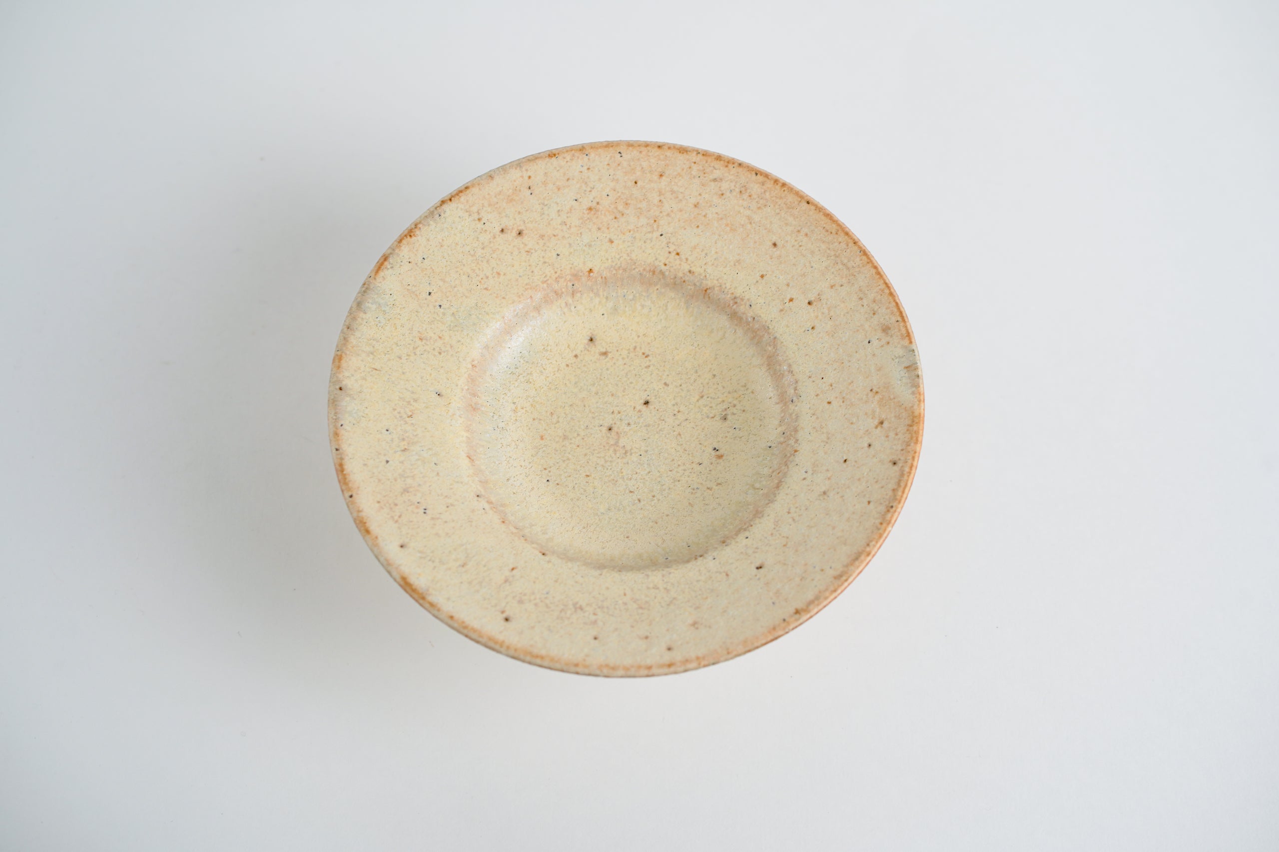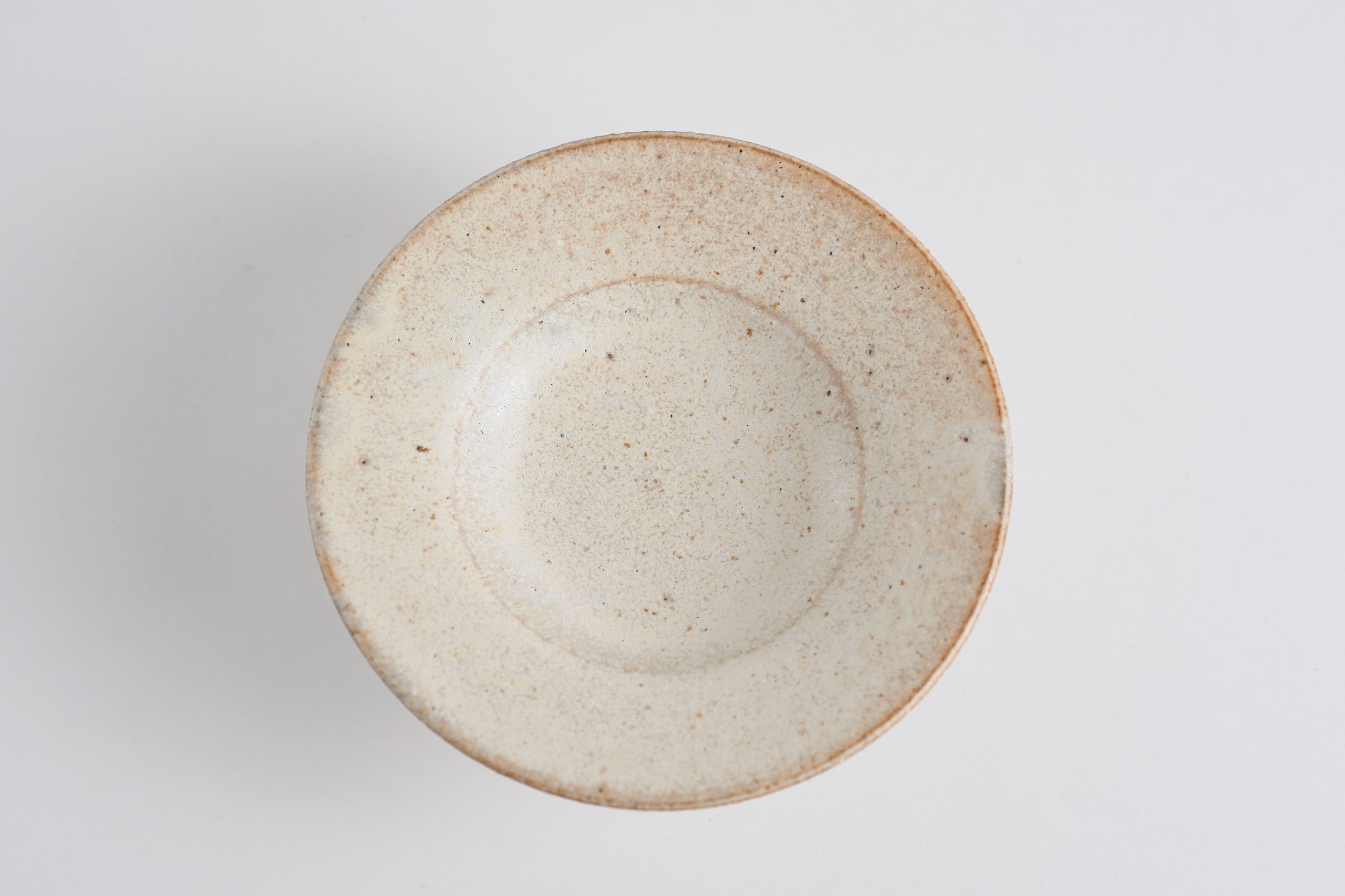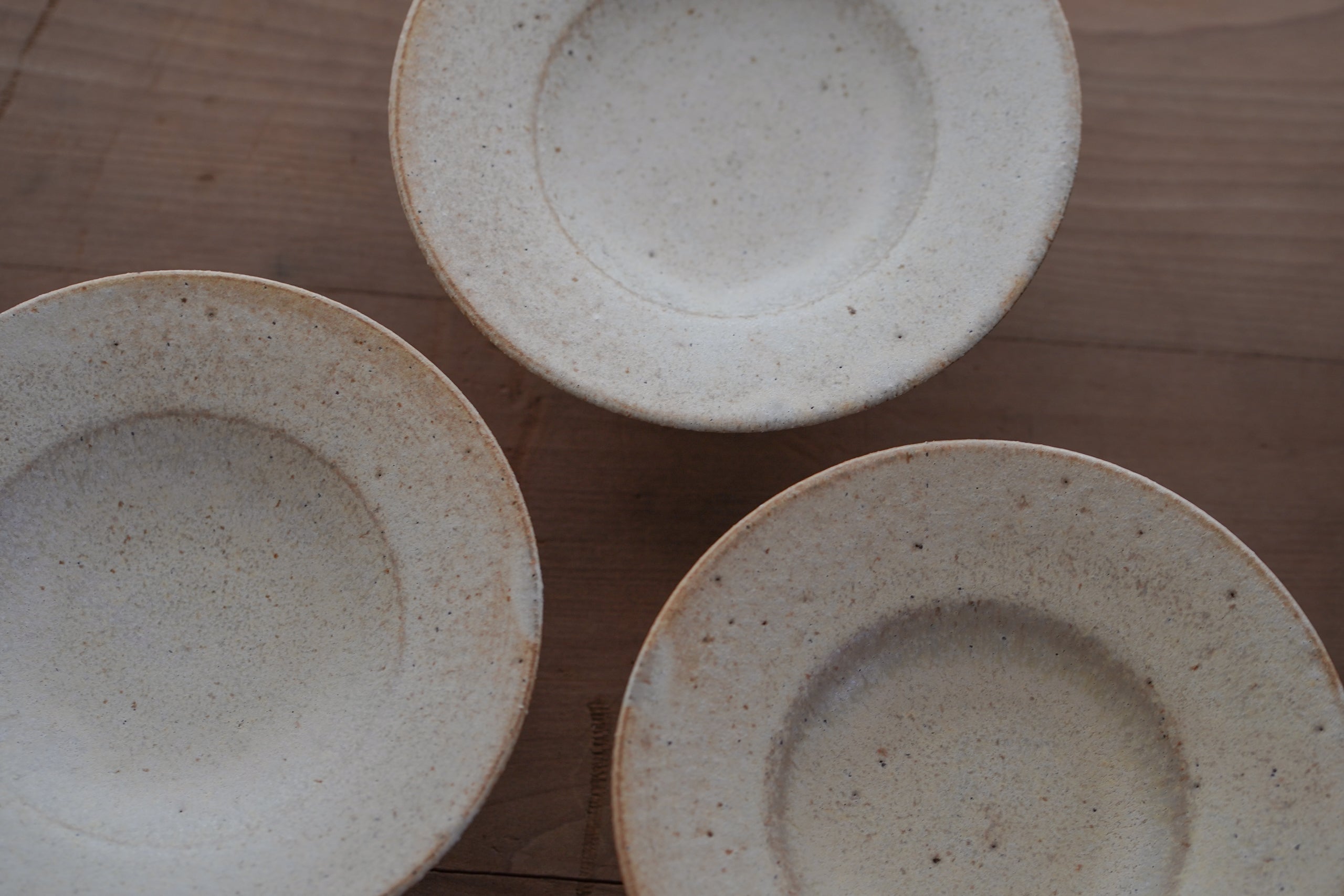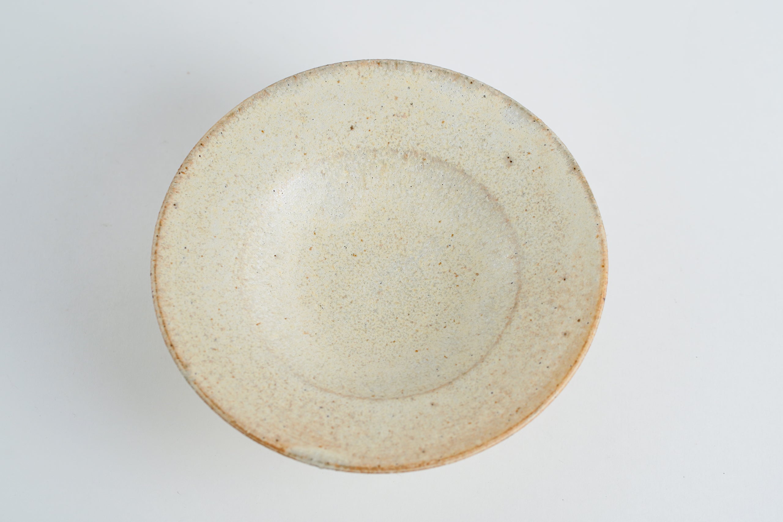 釉色呈現柔和的米白色到淡米色調,表面是細緻的霧面質感,觸感溫潤不滑膩。整個盤面散布著細密的鐵點,這些自然分布的鐵點為素雅的白釉增添豐富的表情。