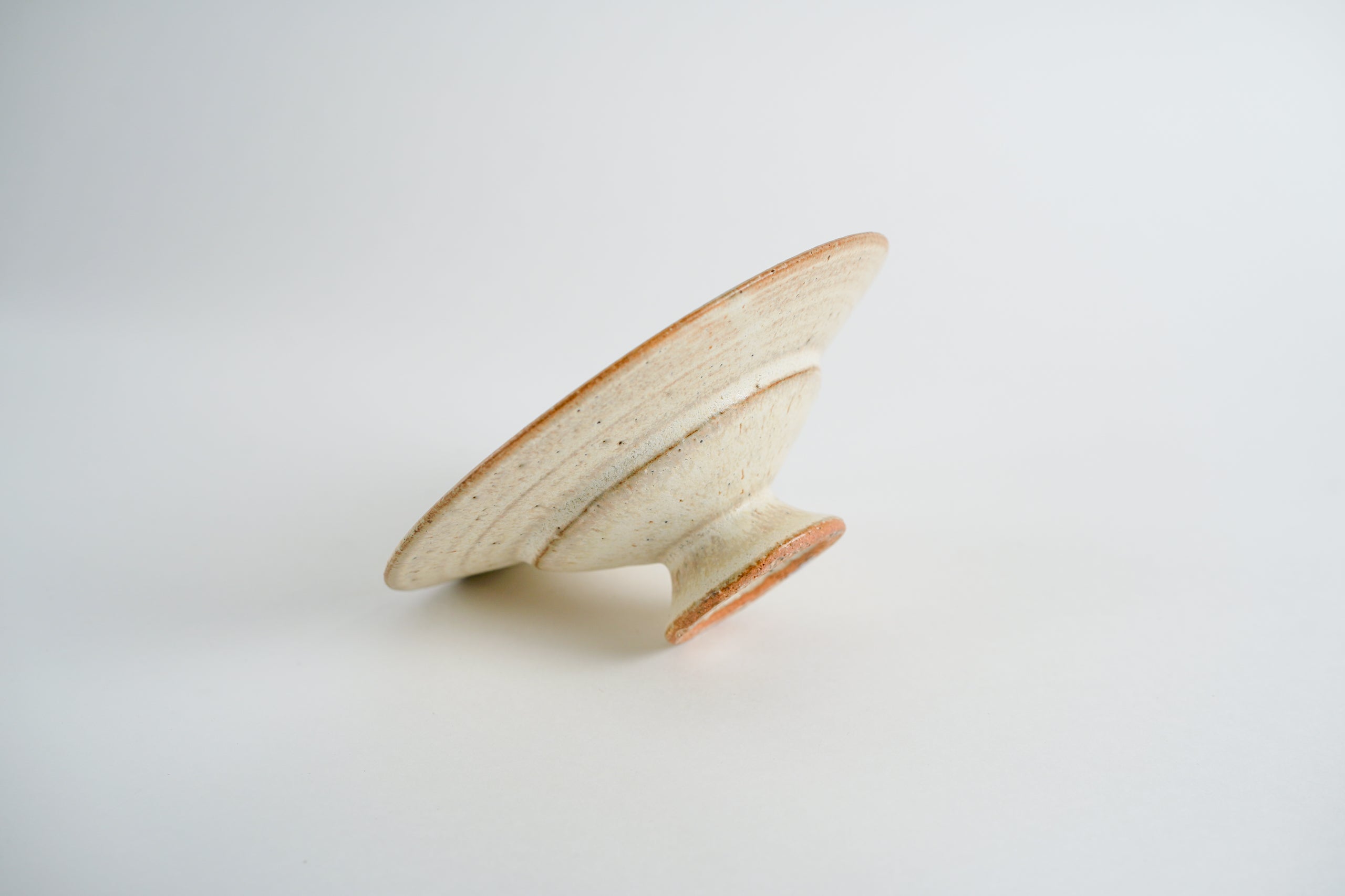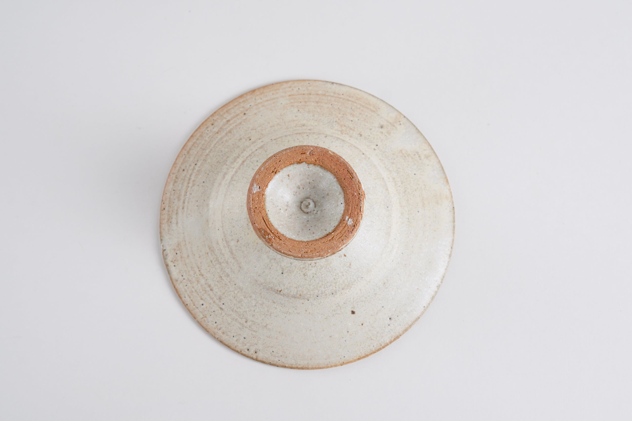 高台部分同樣施以白釉,底部則露出溫潤的褐色陶土,展現手工陶器質樸的一面。