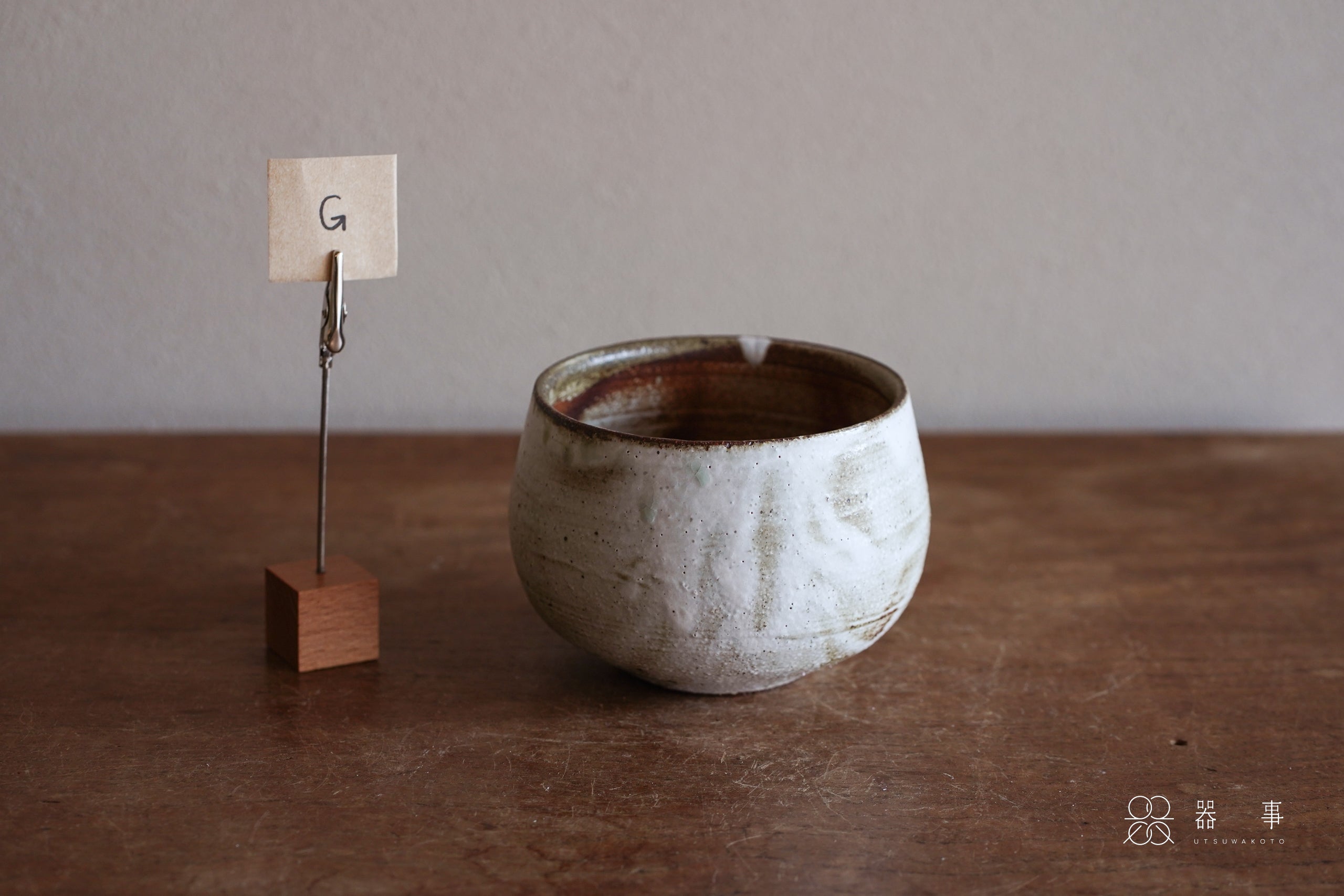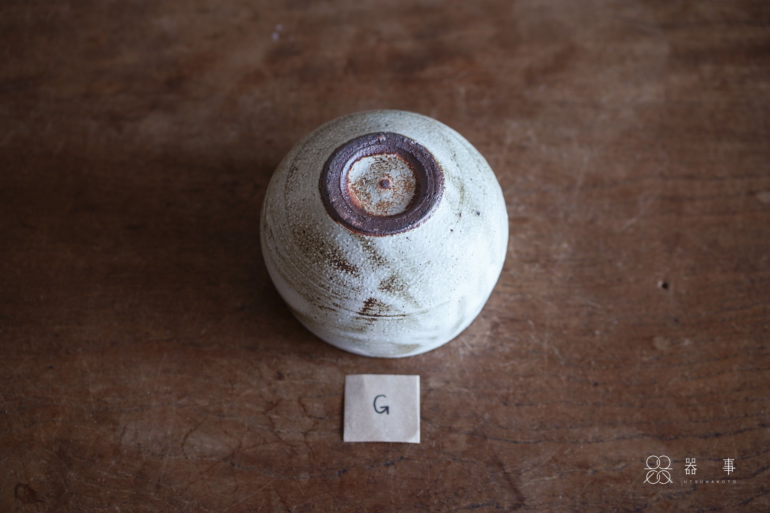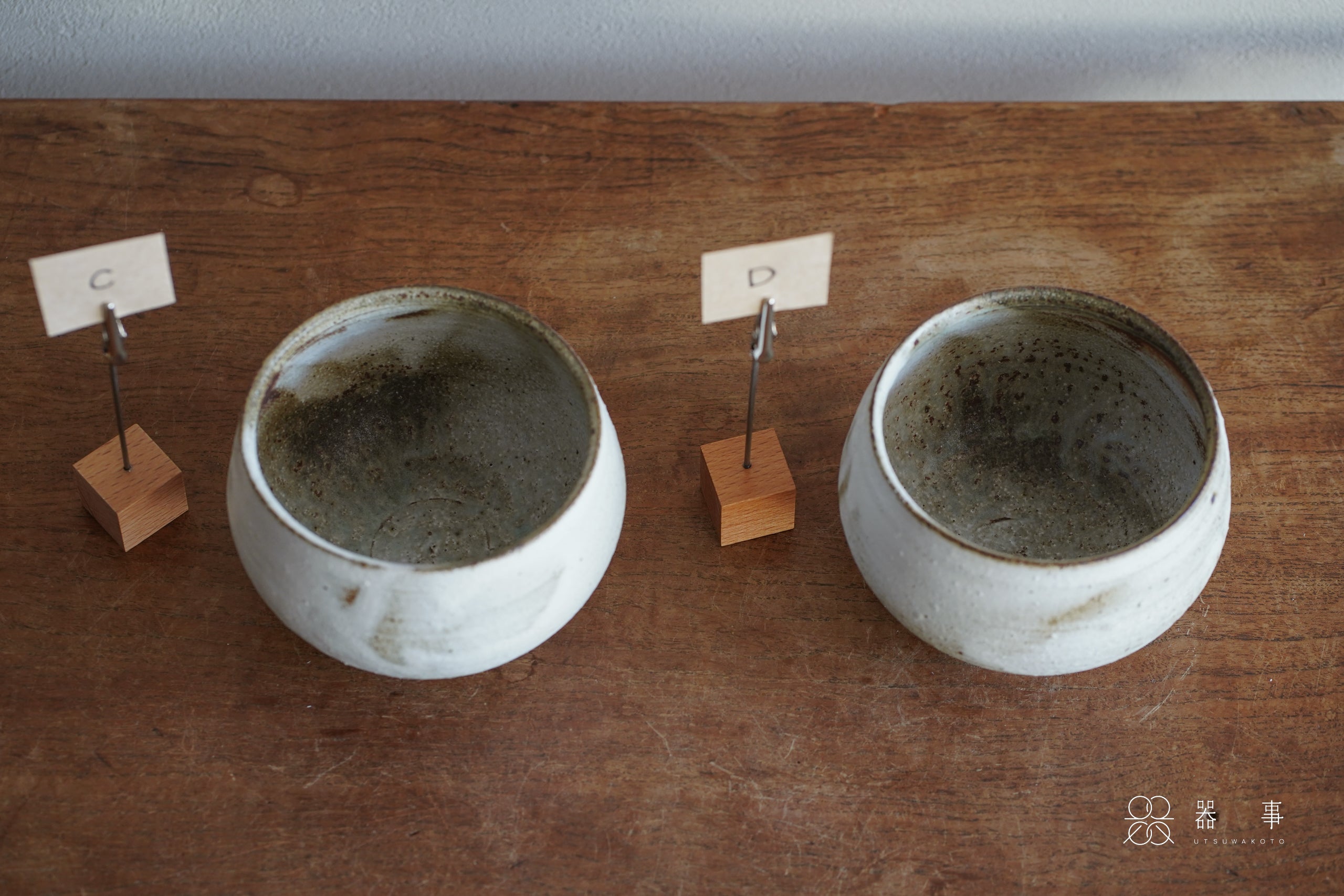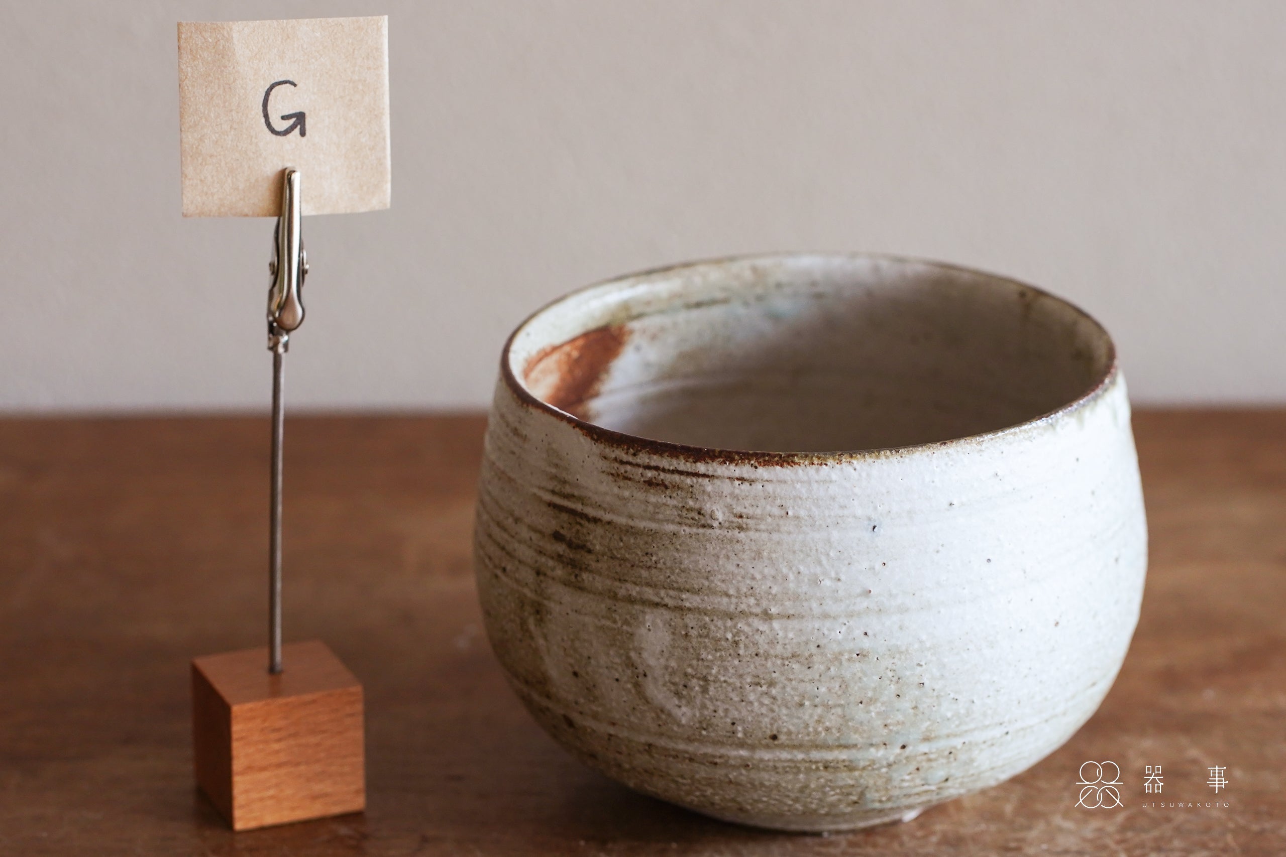 看向茶碗內側,則是截然不同的風景,令人感到驚喜。從赤褐色到灰褐色的隨機變化,與外側的灰白呈現出鮮明的對比,展現手作陶器的獨特色彩。