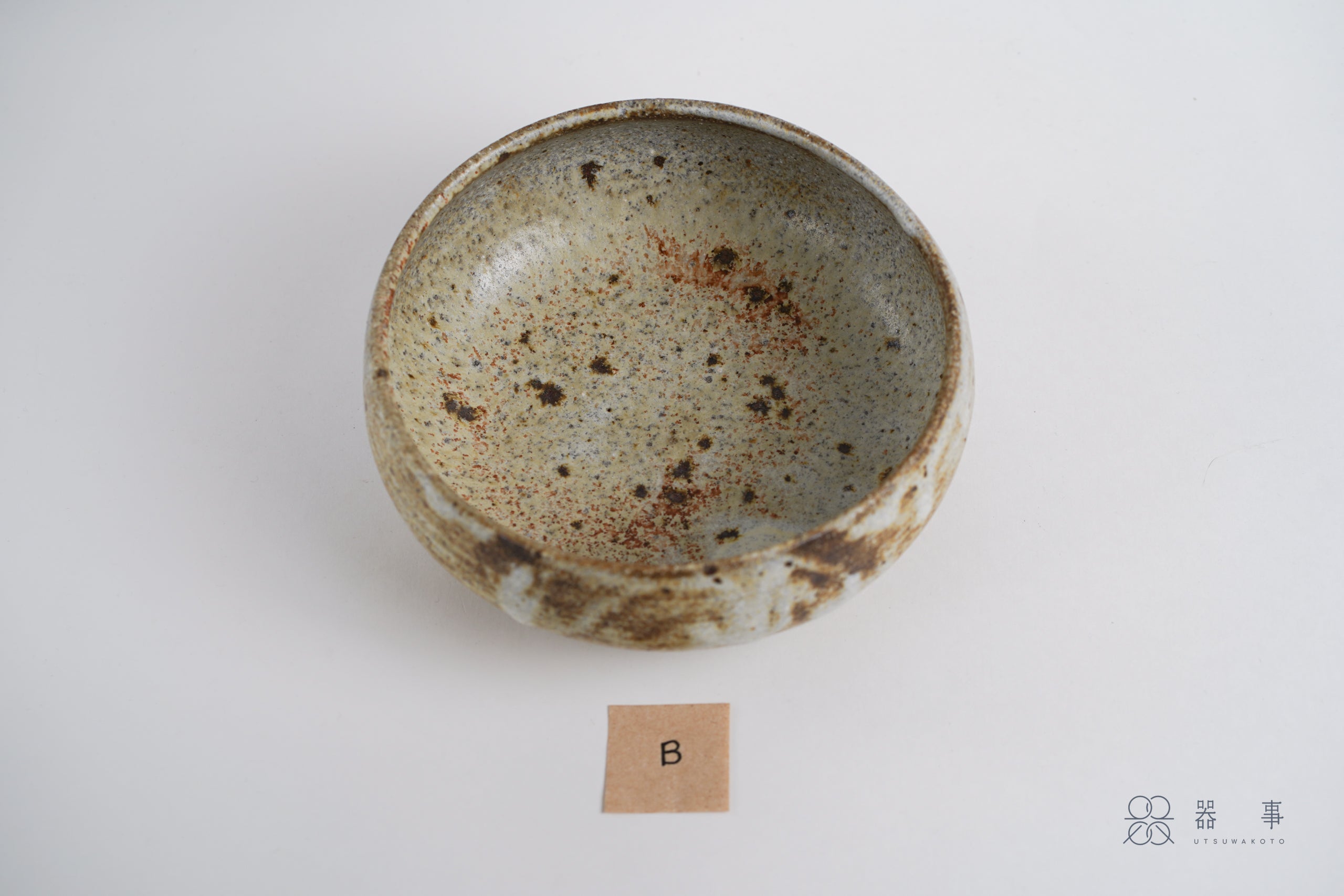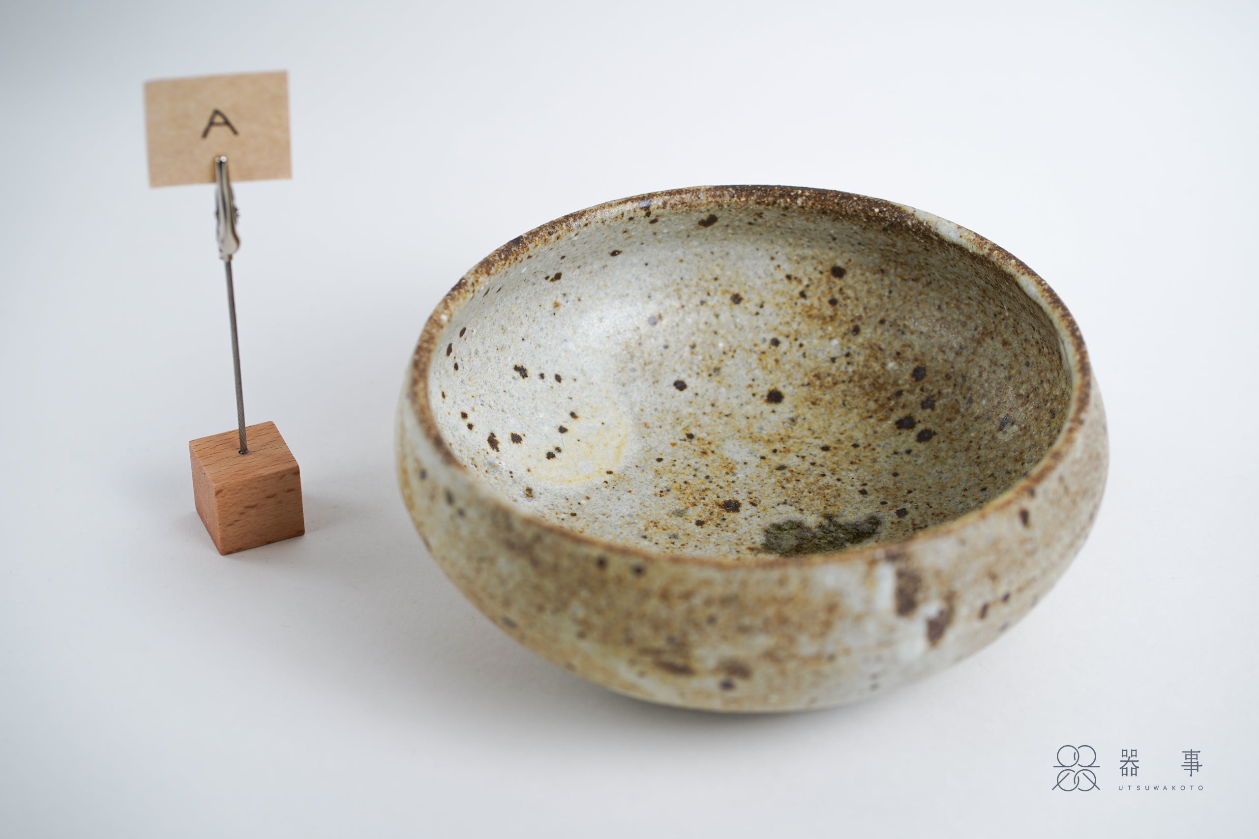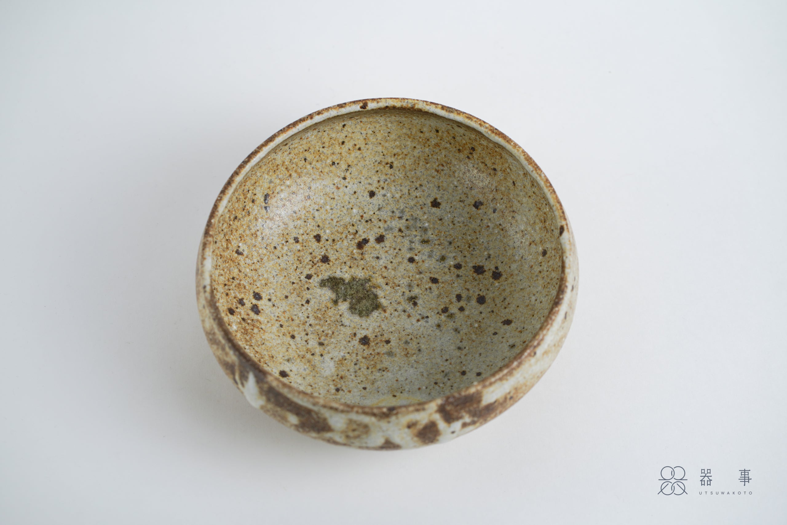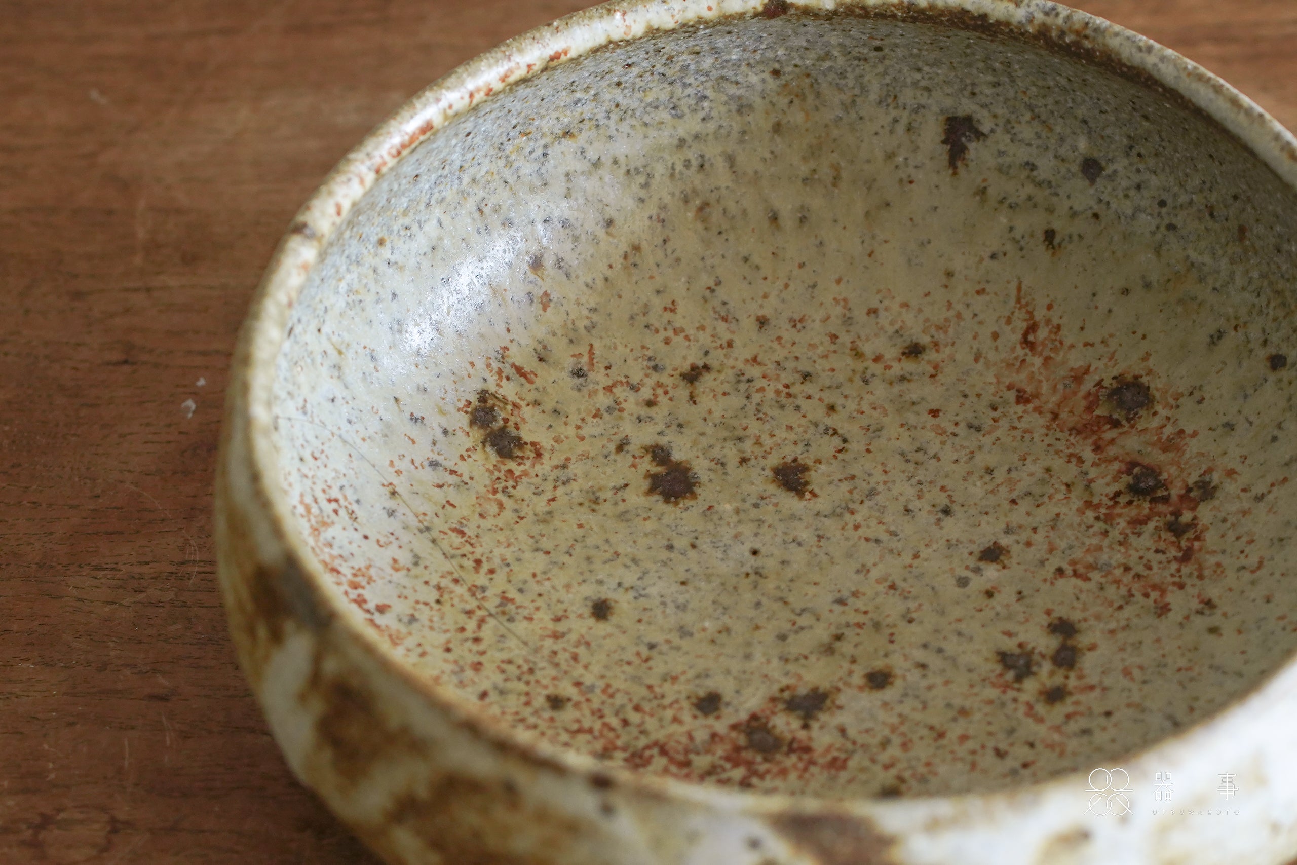 碗內,則是另一番景色。灰黃色調的釉面上散布著大大小小的鐵點,深淺不一的斑點為平靜的碗底增添變化,讓盛裝的料理更加突出。