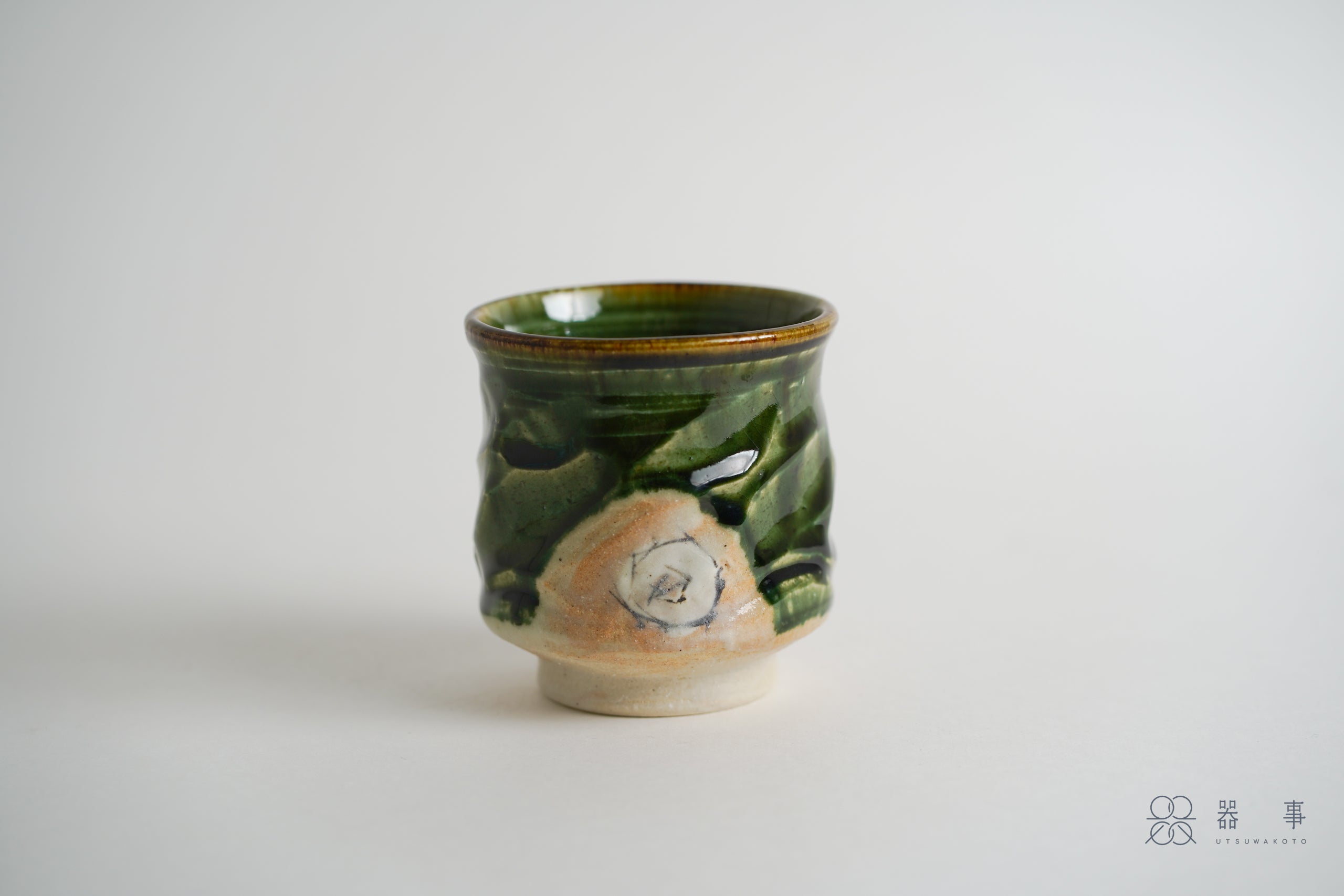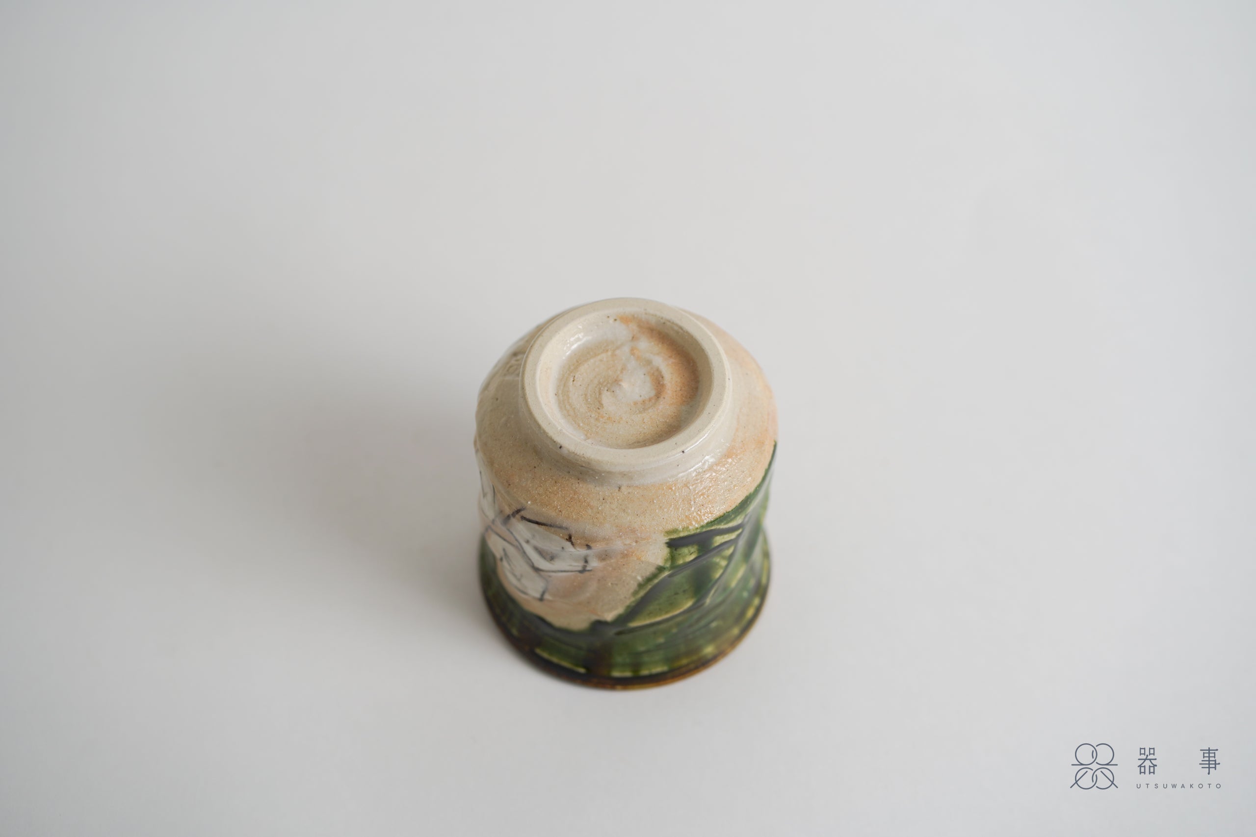 杯身施以傳統的織部釉,深淺不一的綠色調從墨綠到翠綠層層交疊,在光線下展現豐富的光澤變化。