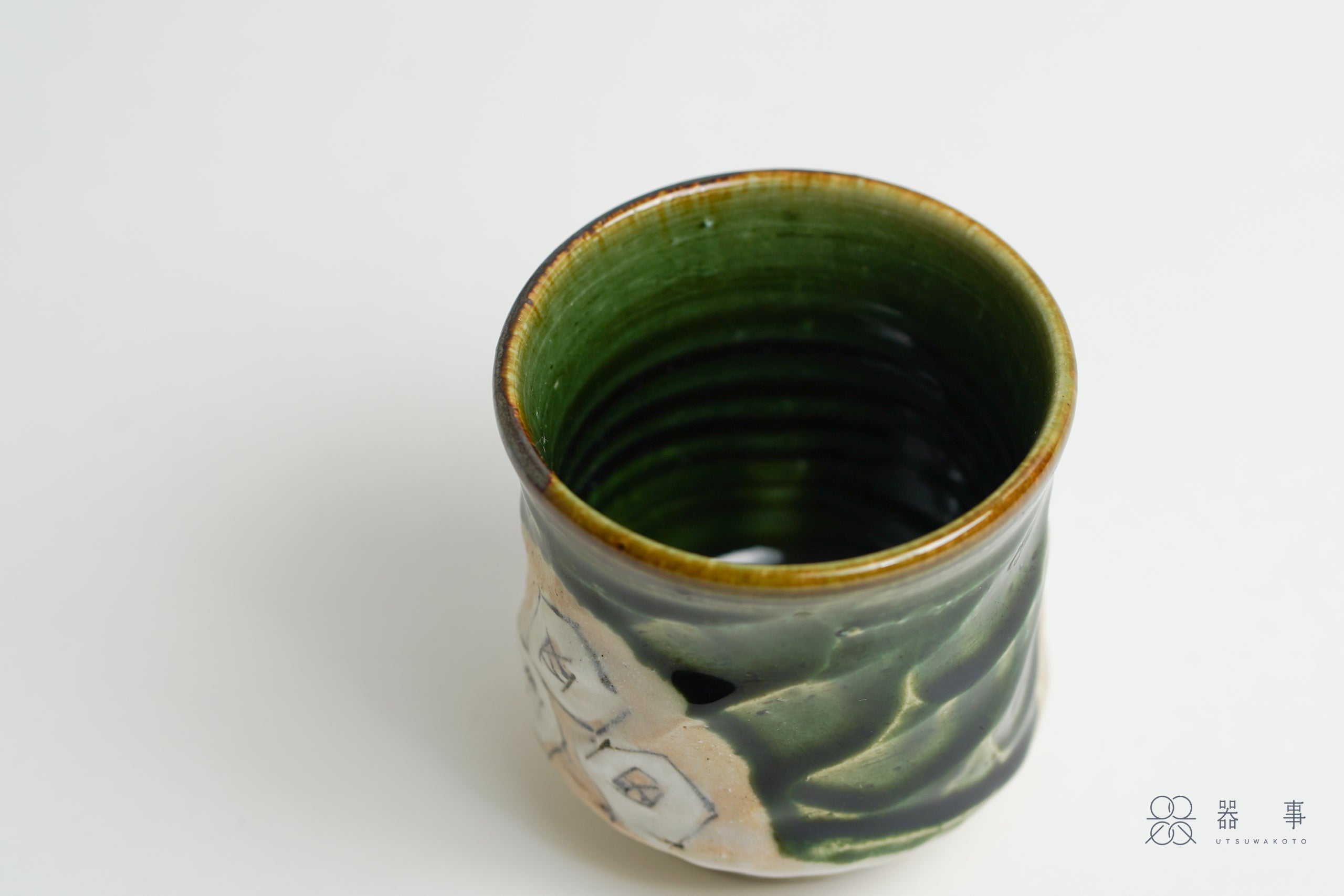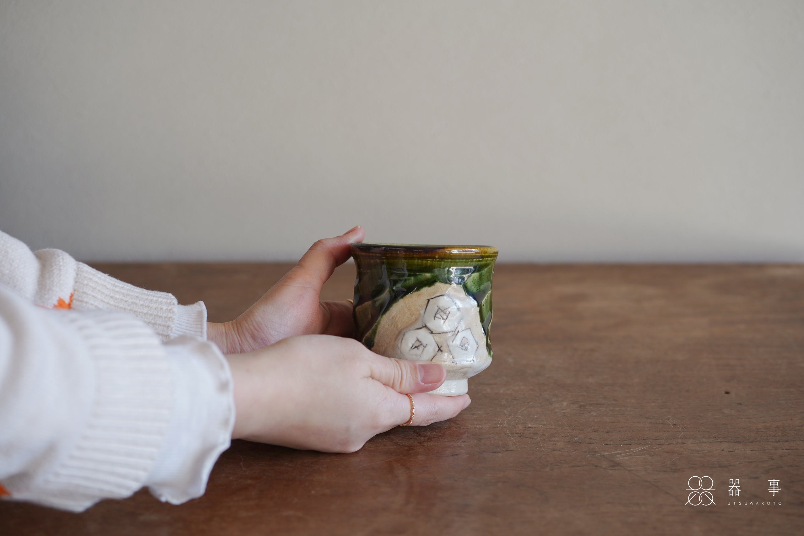 赤根真次老師製作的織部釉湯吞茶杯,將美濃燒經典的織部色彩與現代生活的實用性結合在一起。