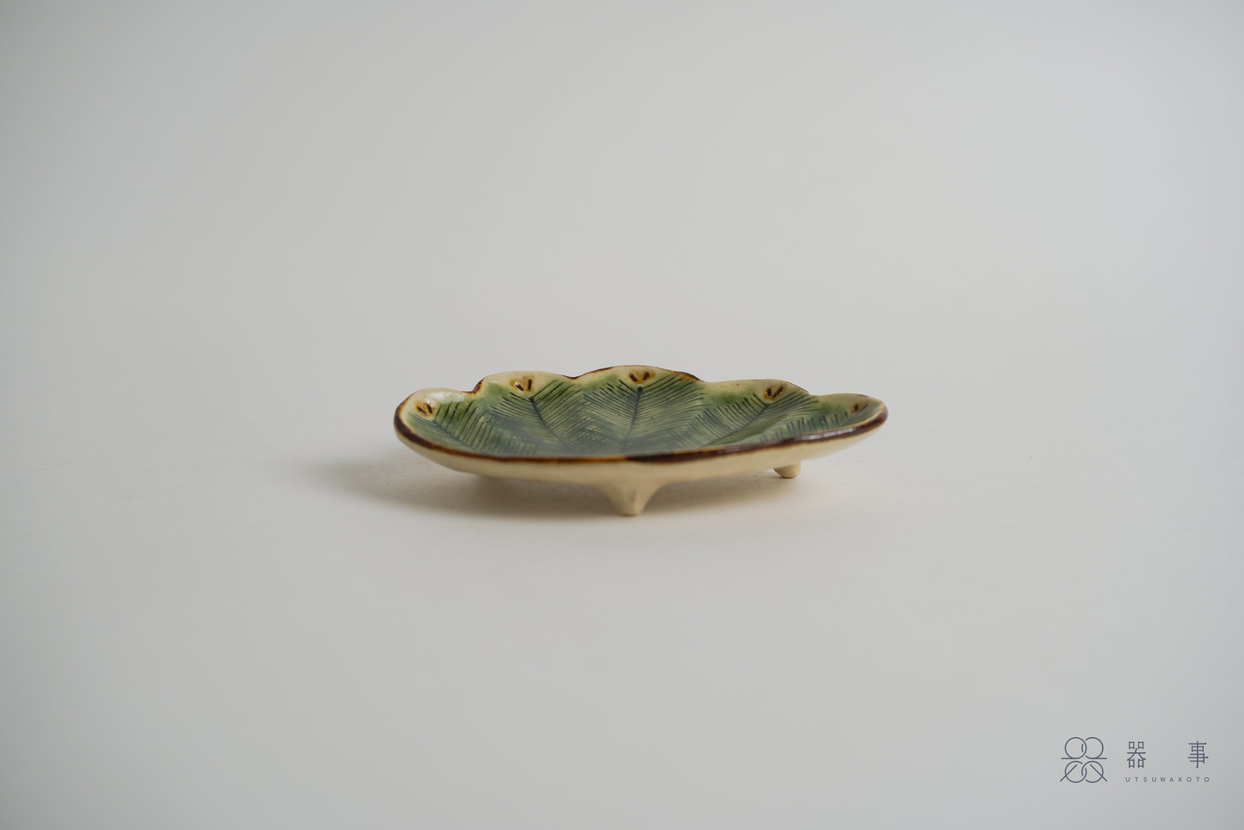 深淺不一的綠色調在釉面上自然暈染,搭配邊緣的褐色鐵繪線條,讓整體色彩層次更加豐富。盤底的松枝圖案則為作品增添了完整的意象。