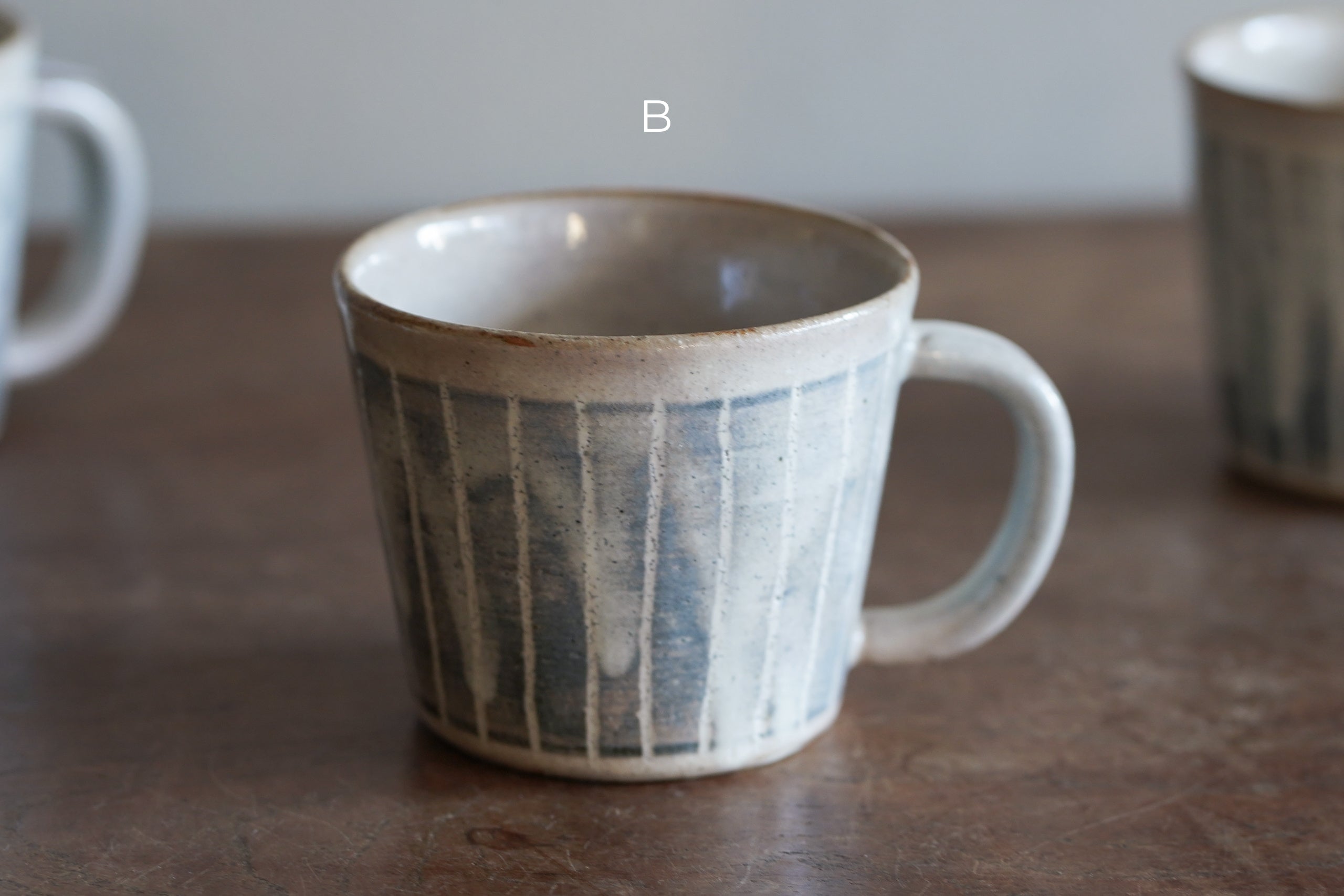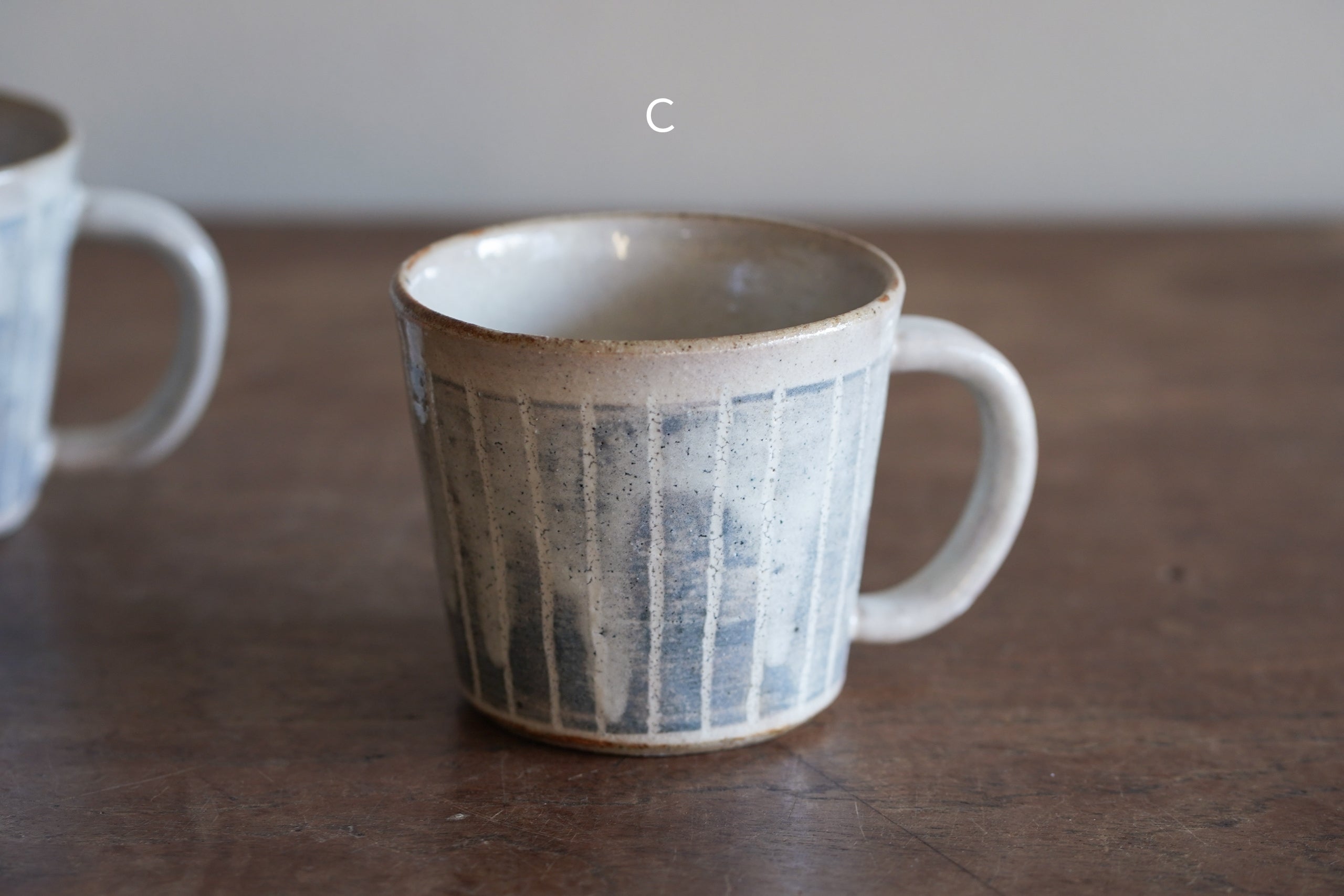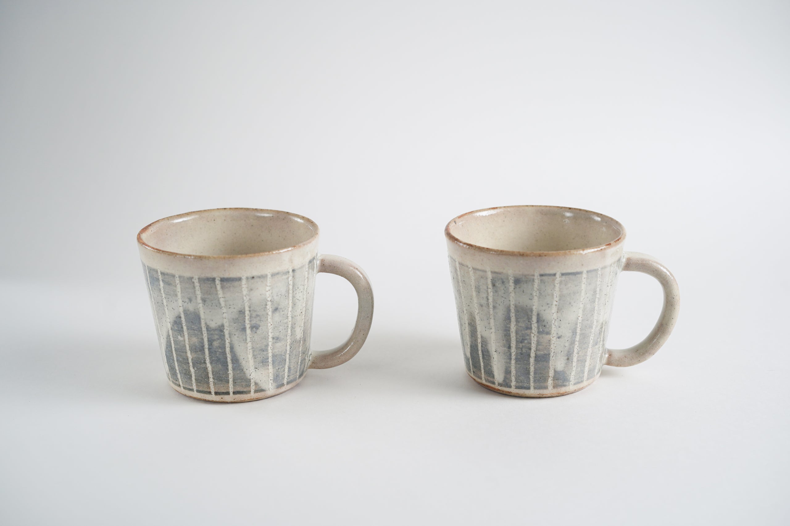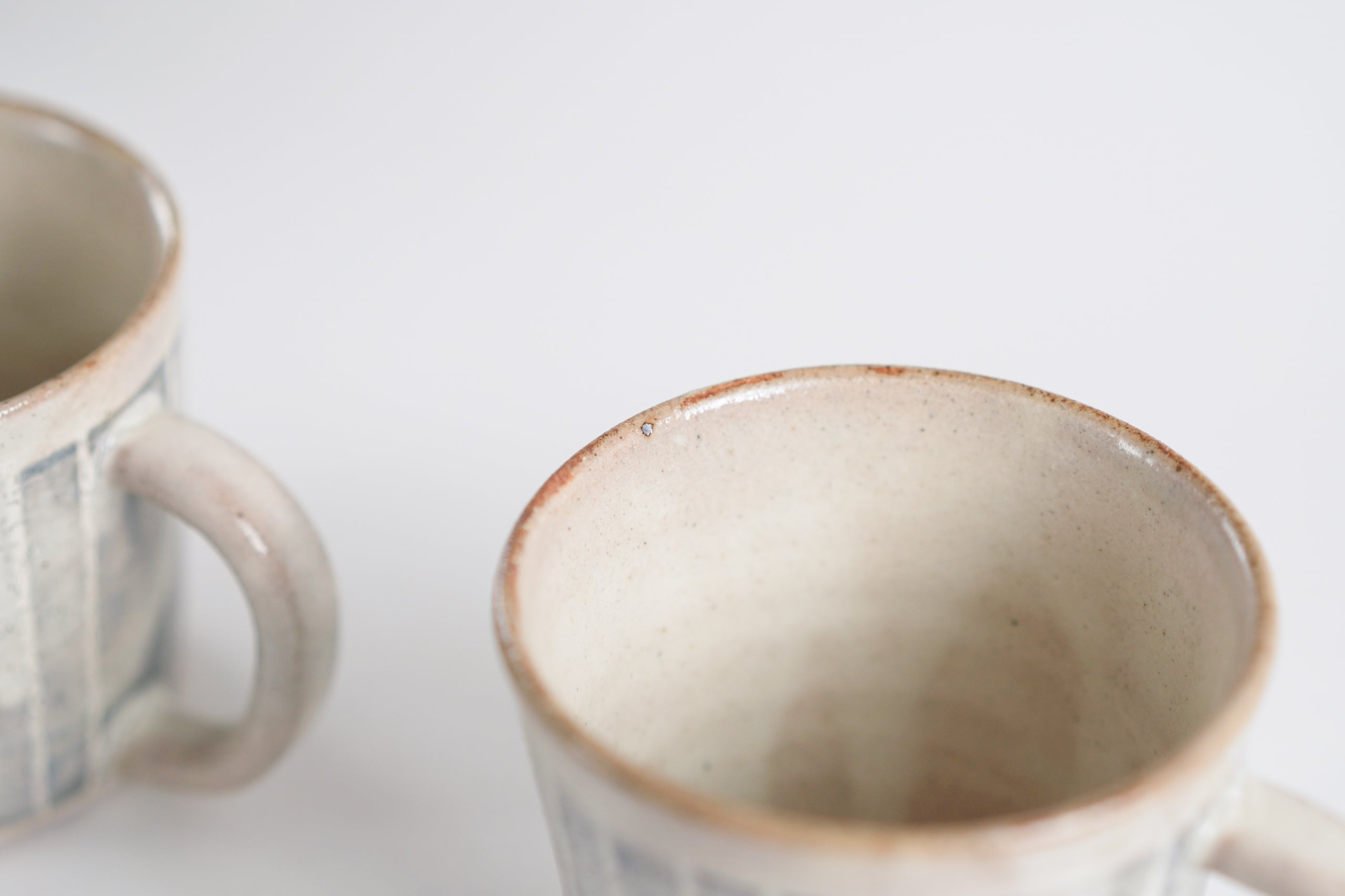 小栗大幸老師製作的粉引條紋馬克杯,呈現溫潤柔和的白色調,外側的垂直條紋圖案刻意保留手繪感,呈現淡雅如水彩畫般的氛圍。