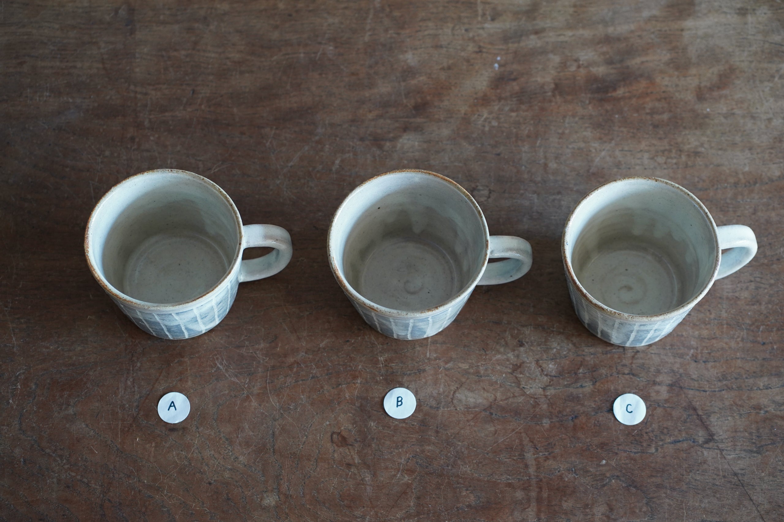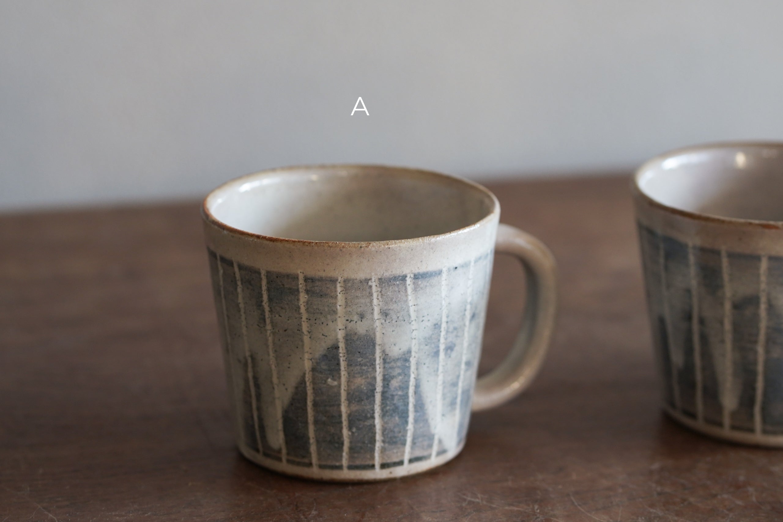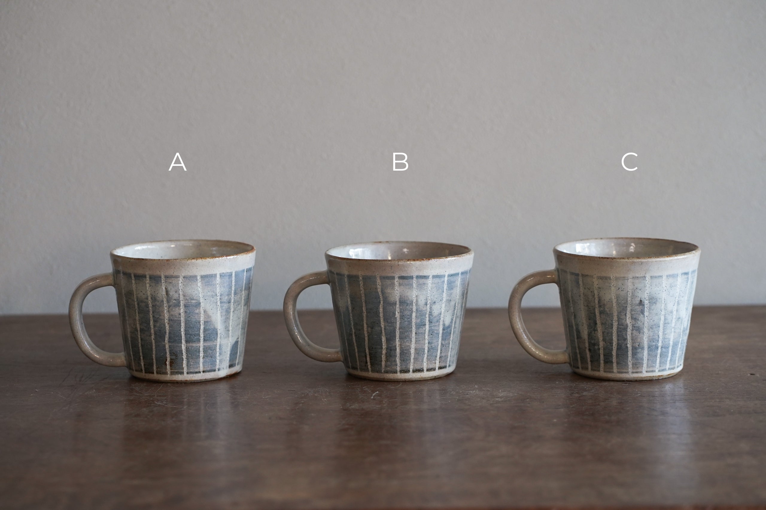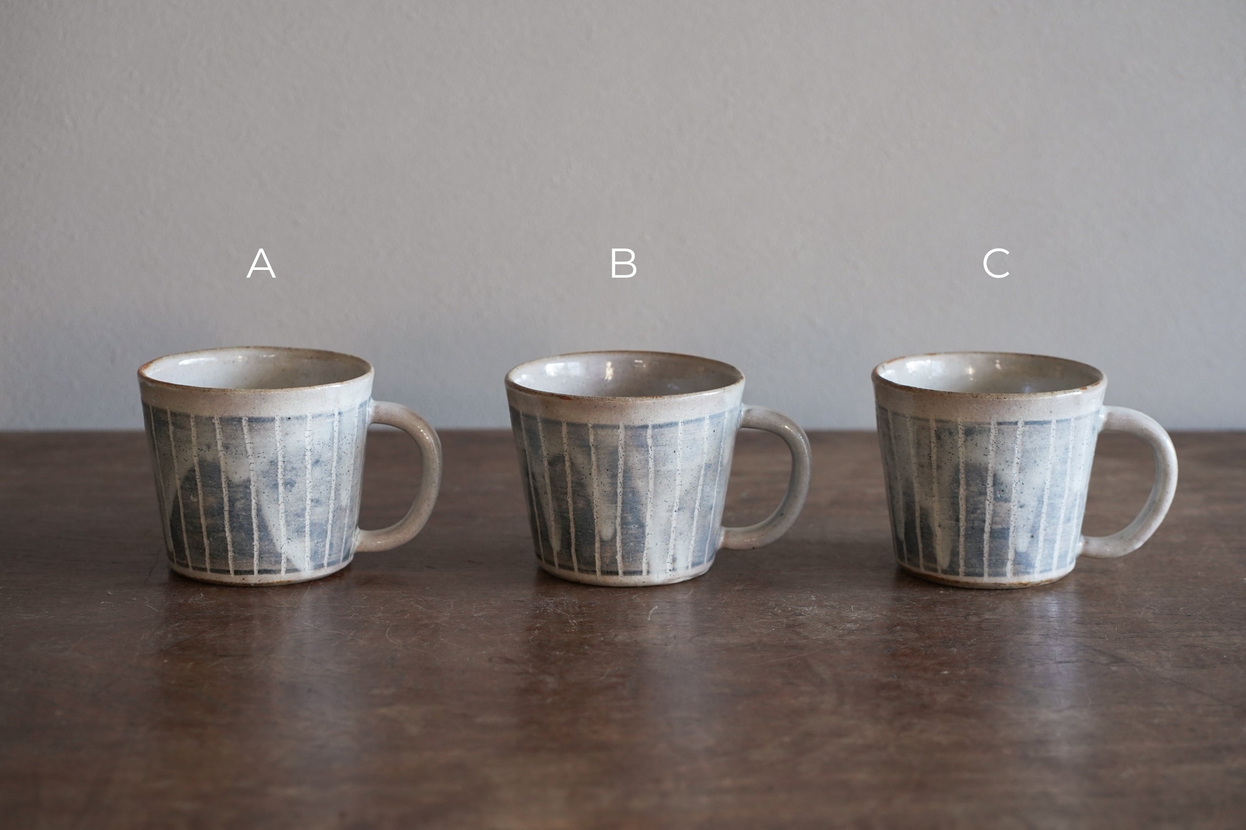 小栗大幸老師製作的粉引條紋馬克杯,呈現溫潤柔和的白色調,外側的垂直條紋圖案刻意保留手繪感,呈現淡雅如水彩畫般的氛圍。