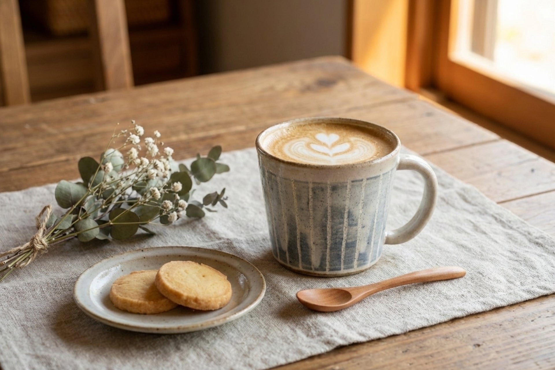 馬克杯適合盛裝咖啡、茶飲或早晨的牛奶。手握時能感受到比想像中輕盈的重量,與陶器溫潤的手感。