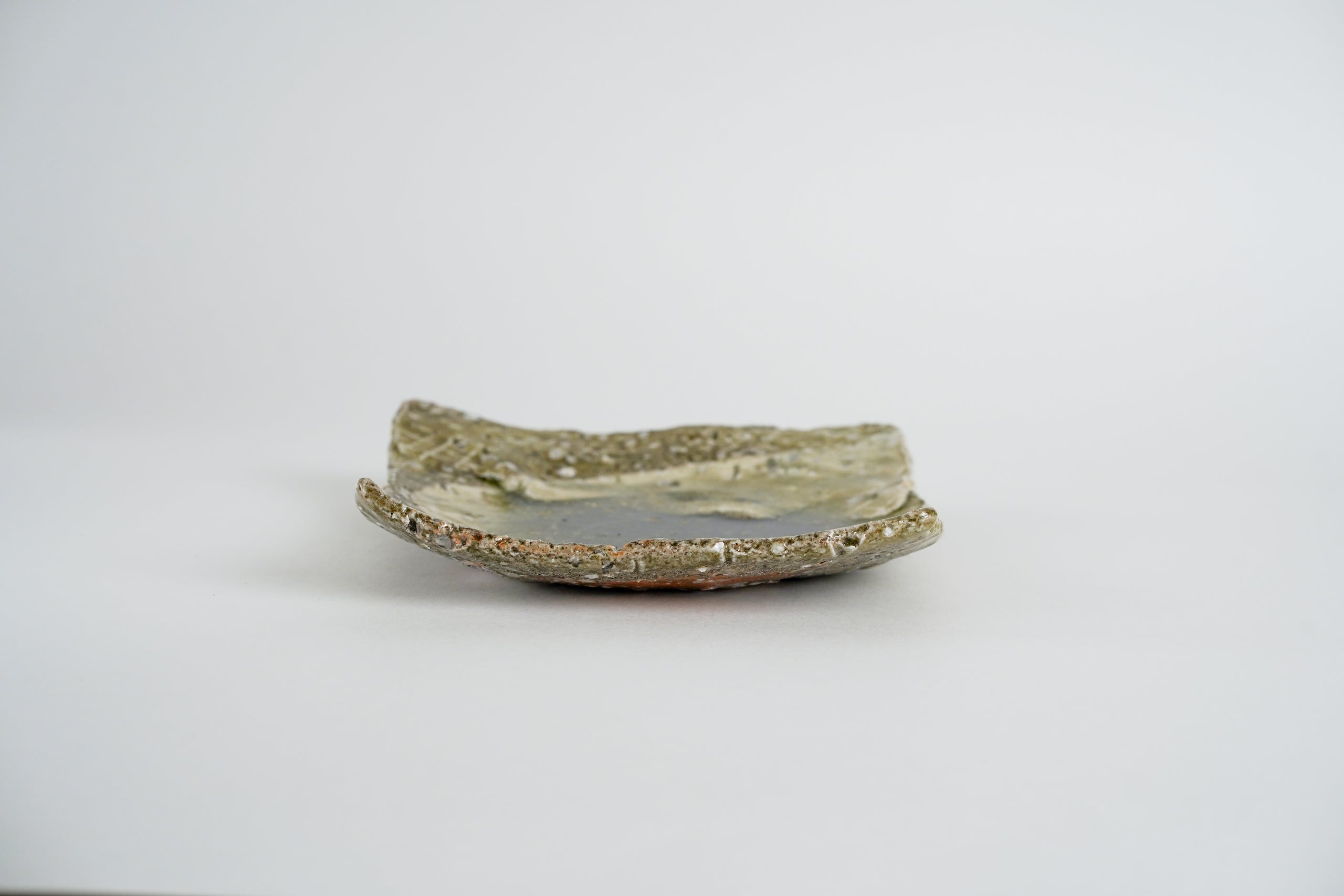 盤緣處露出溫潤的赤褐色的陶土,與綠色玻璃釉形成自然的對比。