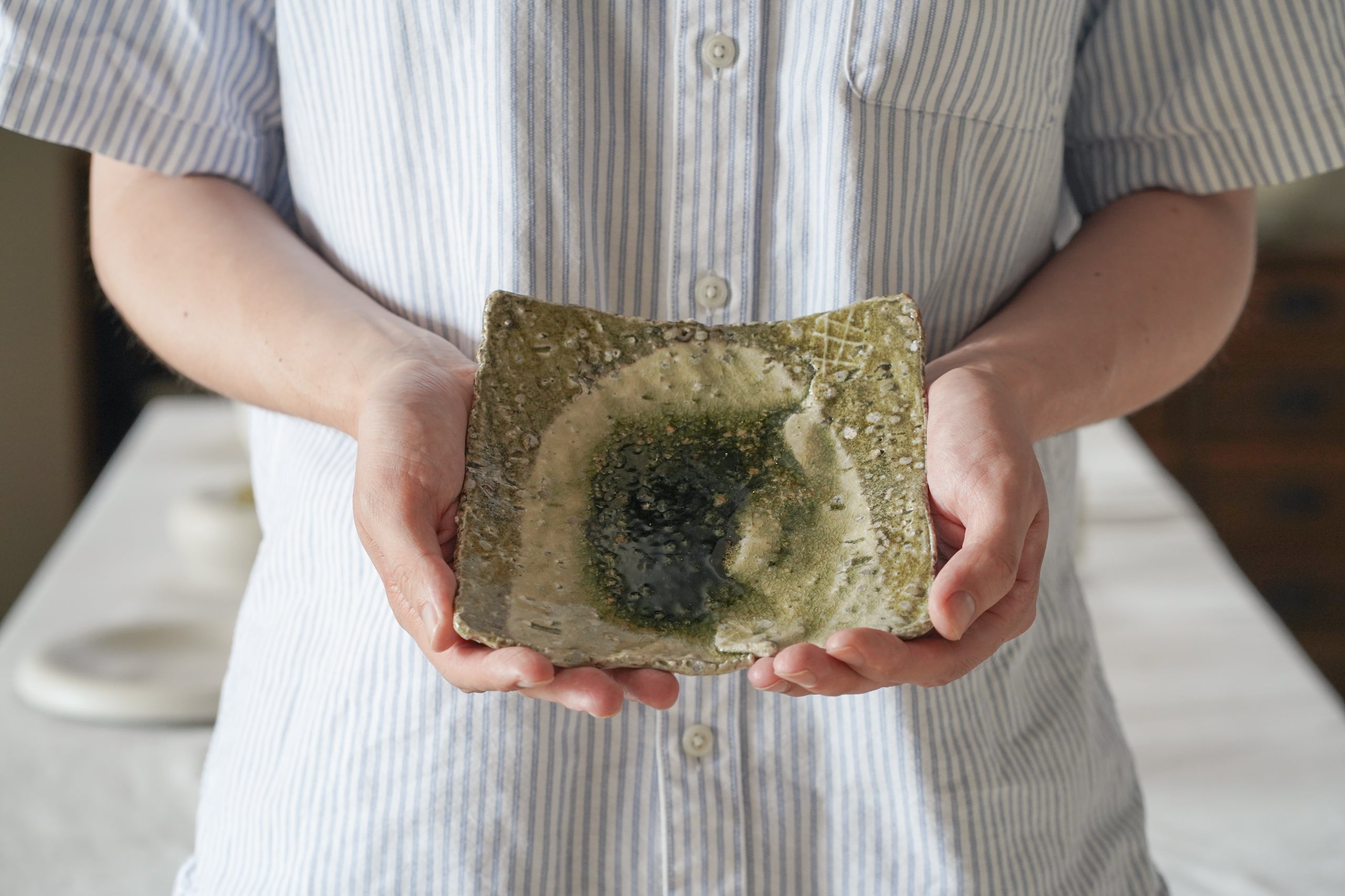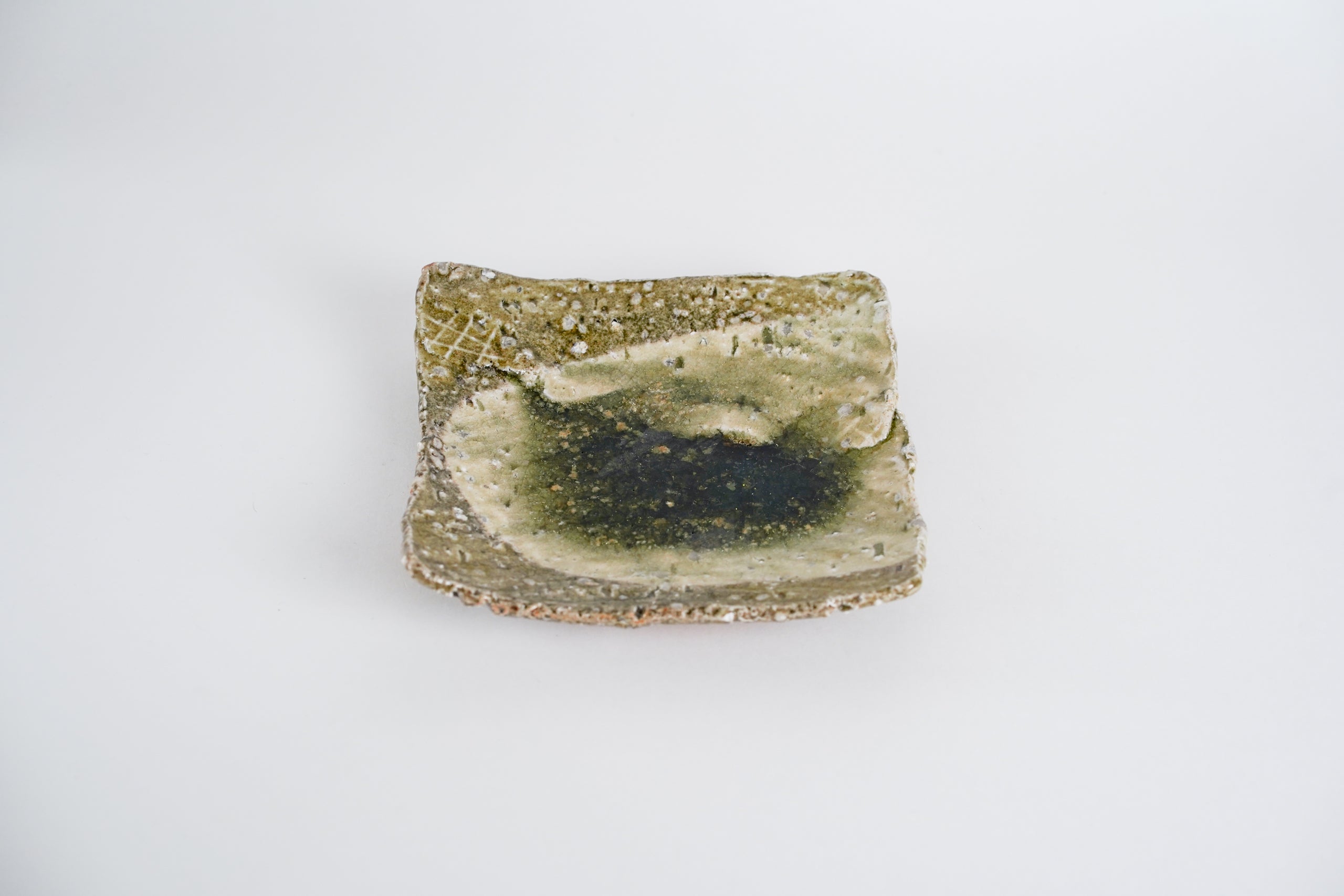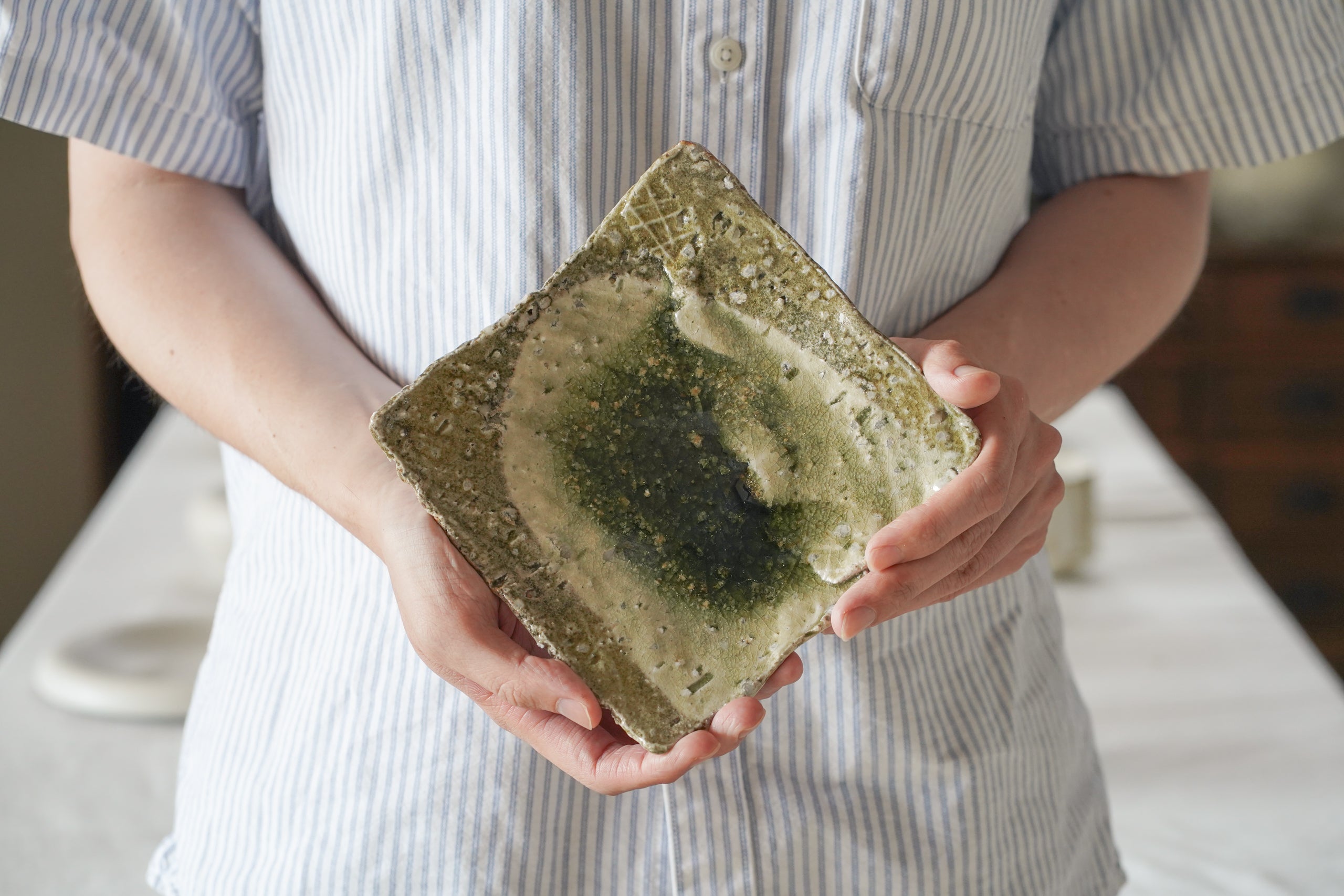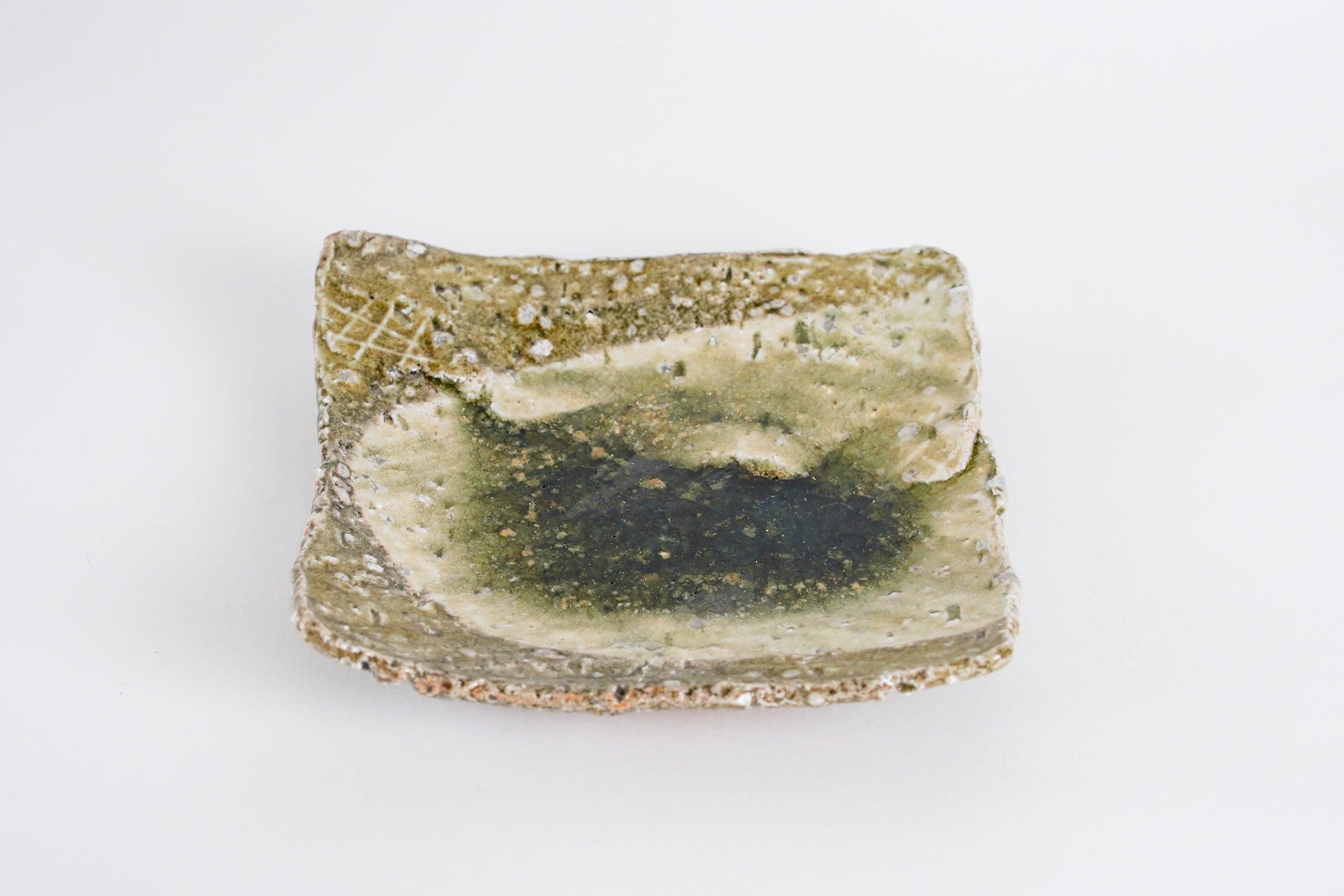 山本一仁老師製作的平角皿,施以傳統的玻璃釉,展現如玻璃般透明深邃的綠色美感。